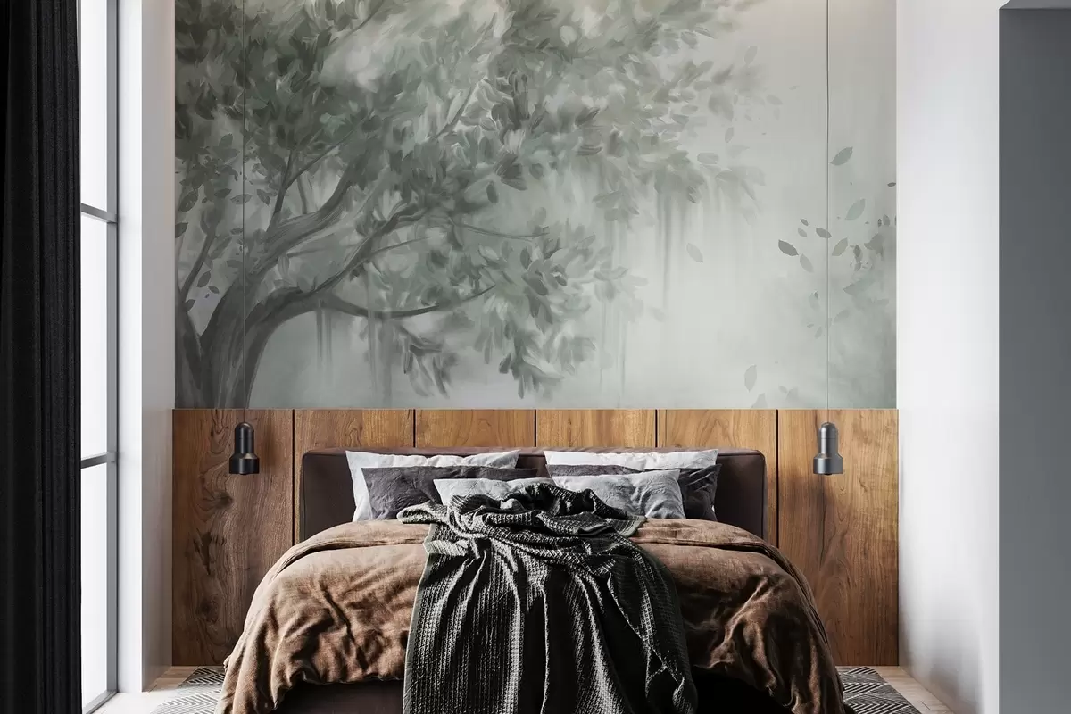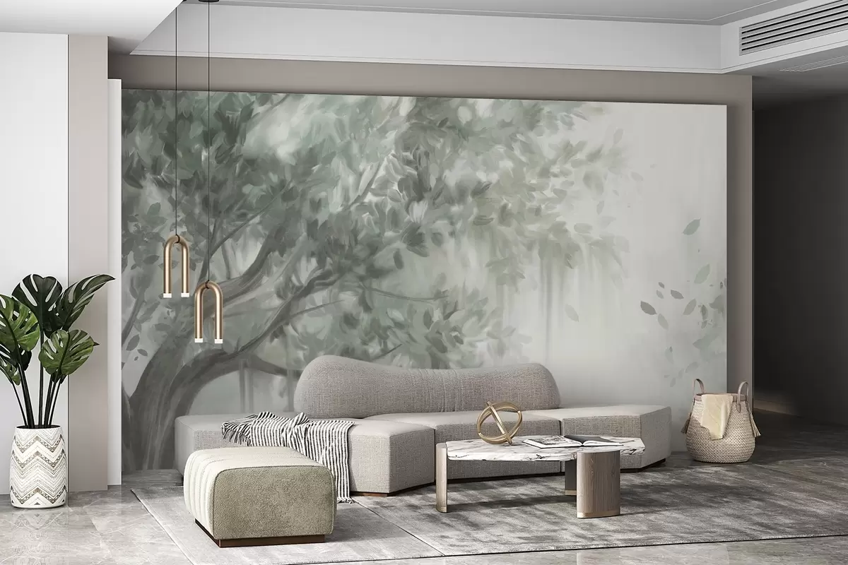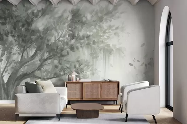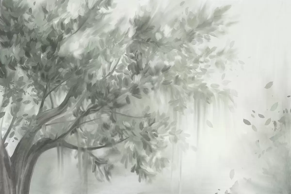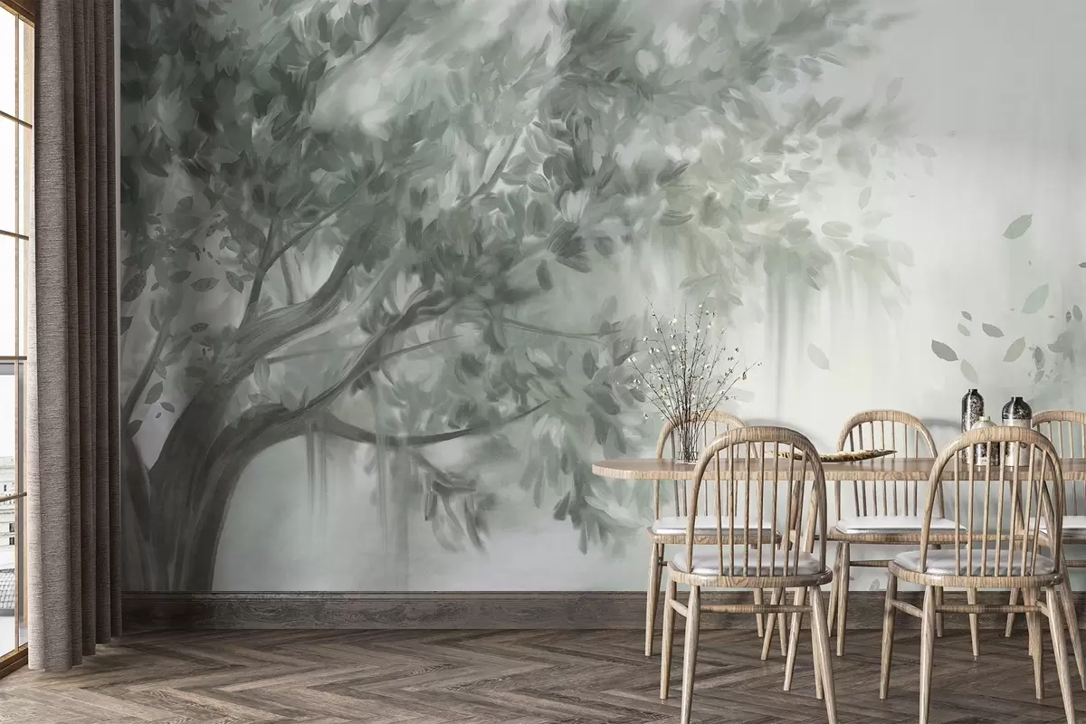 Fotomurales Árbol texturizado con hojas y ramas verdes, con un fondo suave y difuminado. Nr. w09650v1