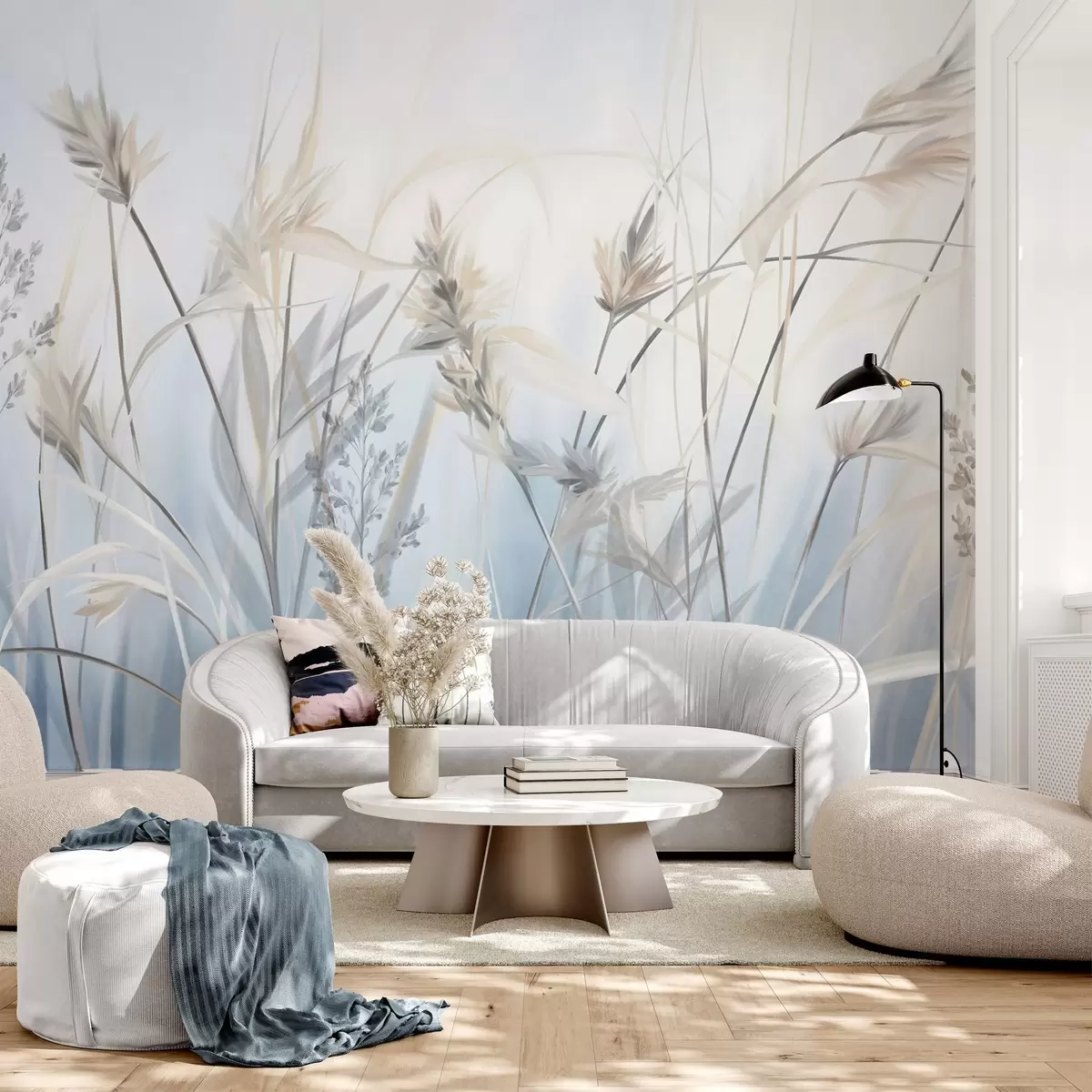 Fotomurales Tallos altos y secos de hierba con puntas plumosas en tonos apagados, fondo azul y blanco suave y difuminado. Nr. w09652