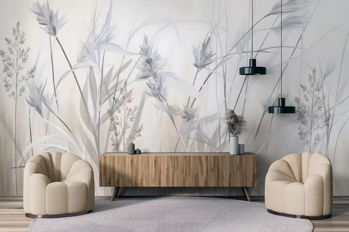 Fotomurales Tallos altos y secos de hierba con puntas plumosas en tonos apagados, fondo blanco y beige suave y difuminado. Nr. w09652v1