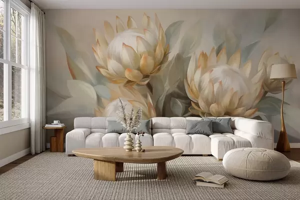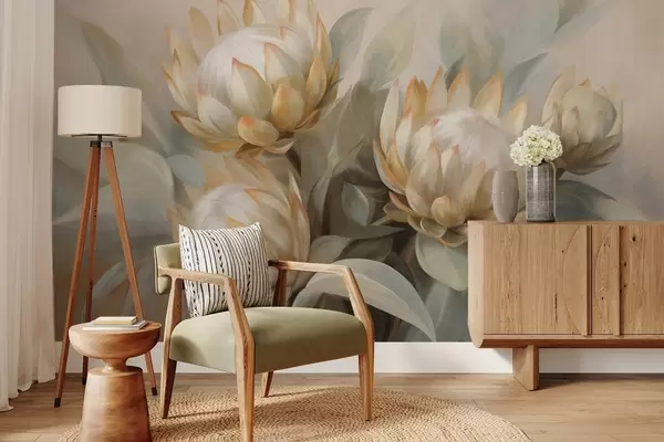 Fotomurales Flores de protea con textura, hojas verdes y un fondo suave y difuminado. Nr. w09738