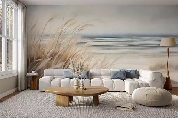 Fotomurales Paisaje con textura, con hierba seca en una playa de arena, con el océano y el cielo al fondo. Nr. w09739