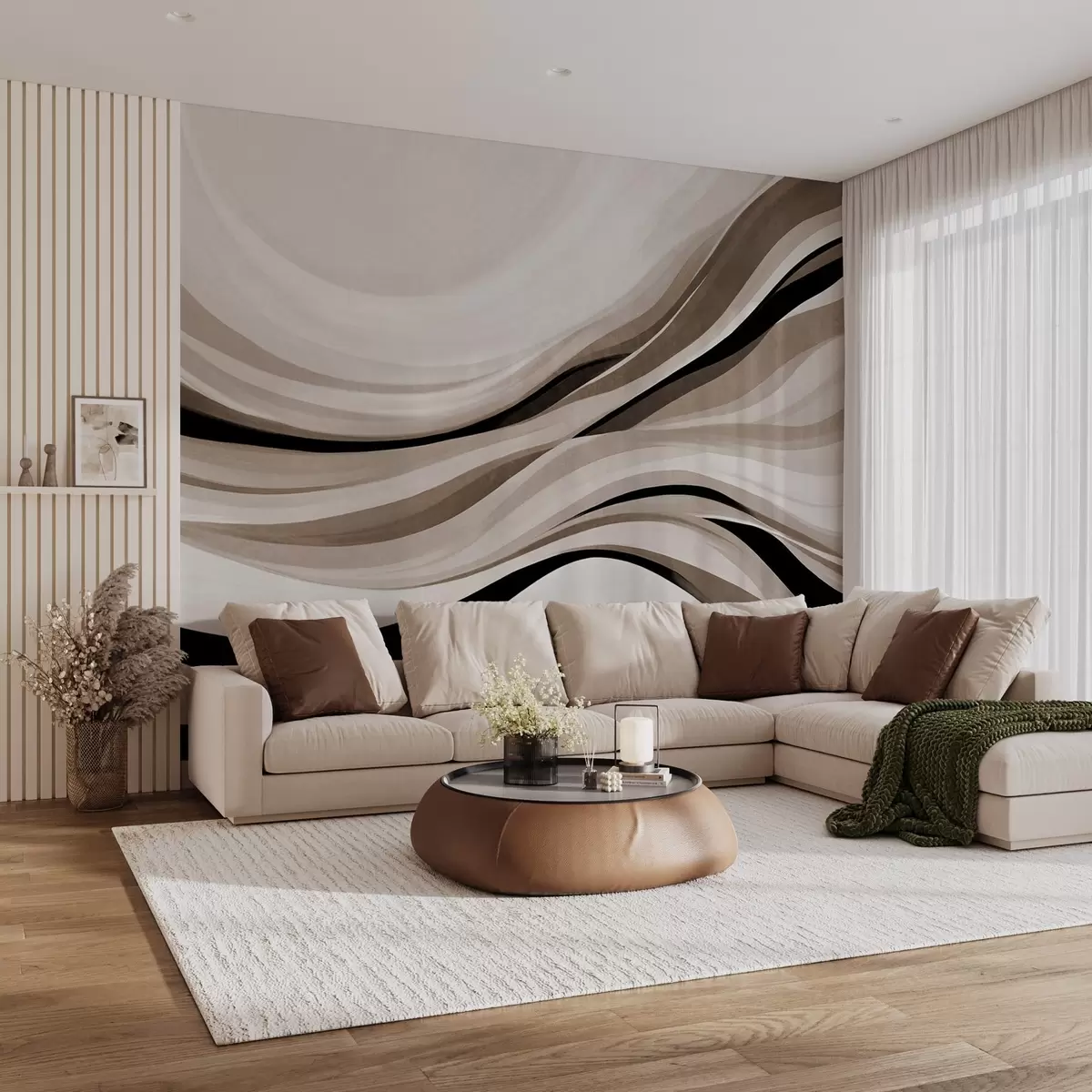 Fotomurales Líneas onduladas abstractas en tonos beige y negro sobre un fondo claro, arte texturizado. Nr. w09748