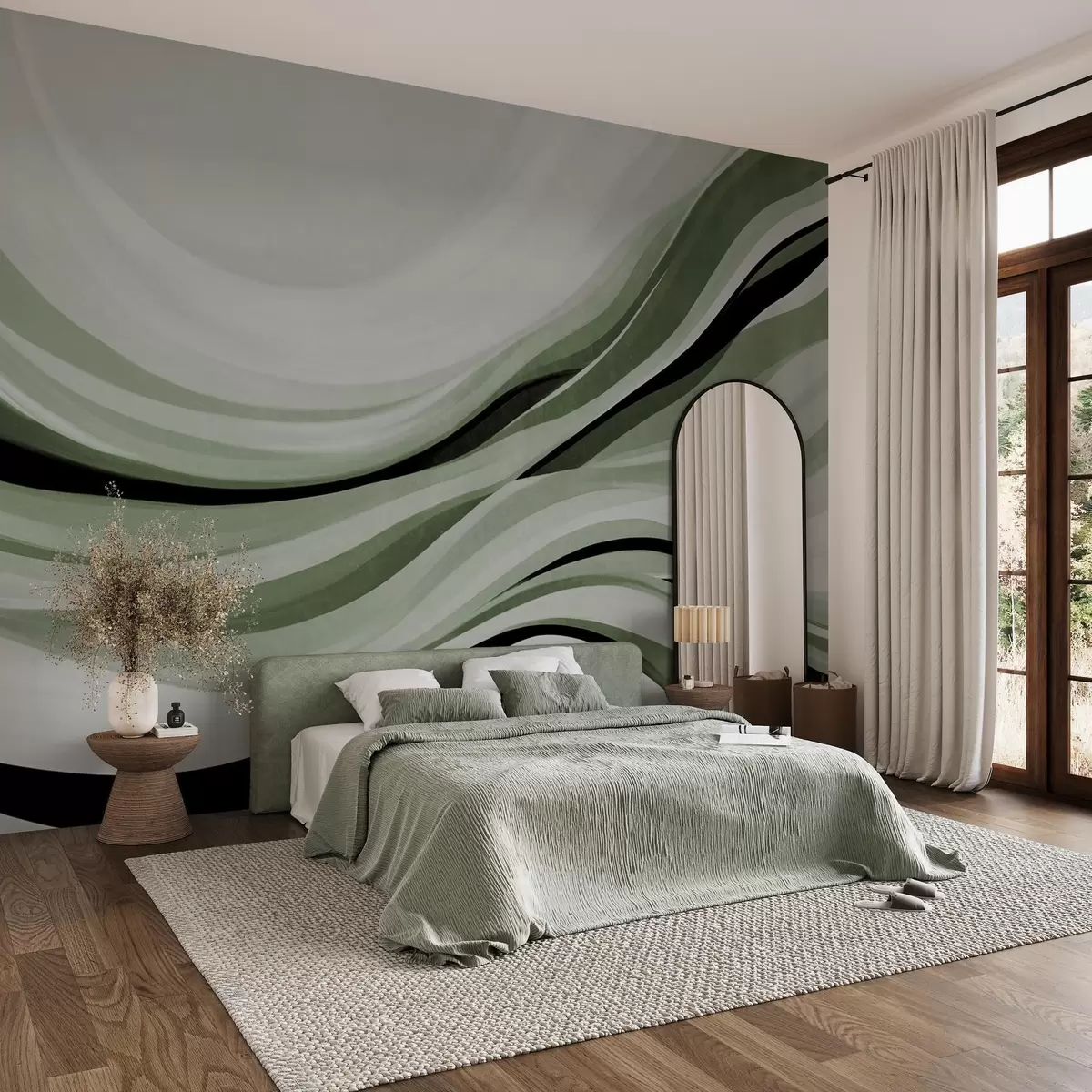 Fotomurales Líneas onduladas abstractas en tonos verdes y negros sobre un fondo claro, arte texturizado. Nr. w09748v1