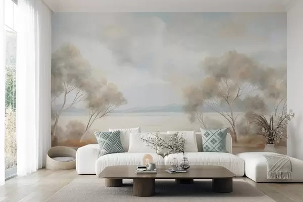 Fotomurales Un estilo de pintura con textura paisajística con árboles bajo un cielo nublado. Nr. w09753