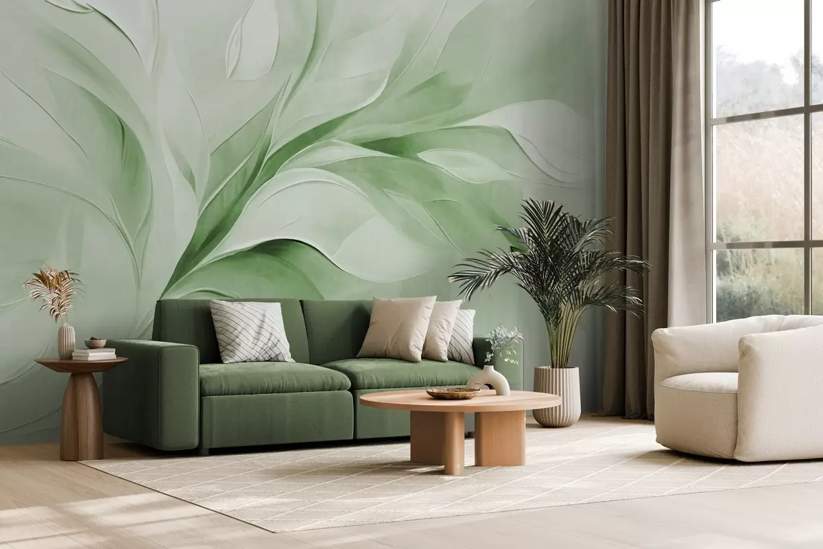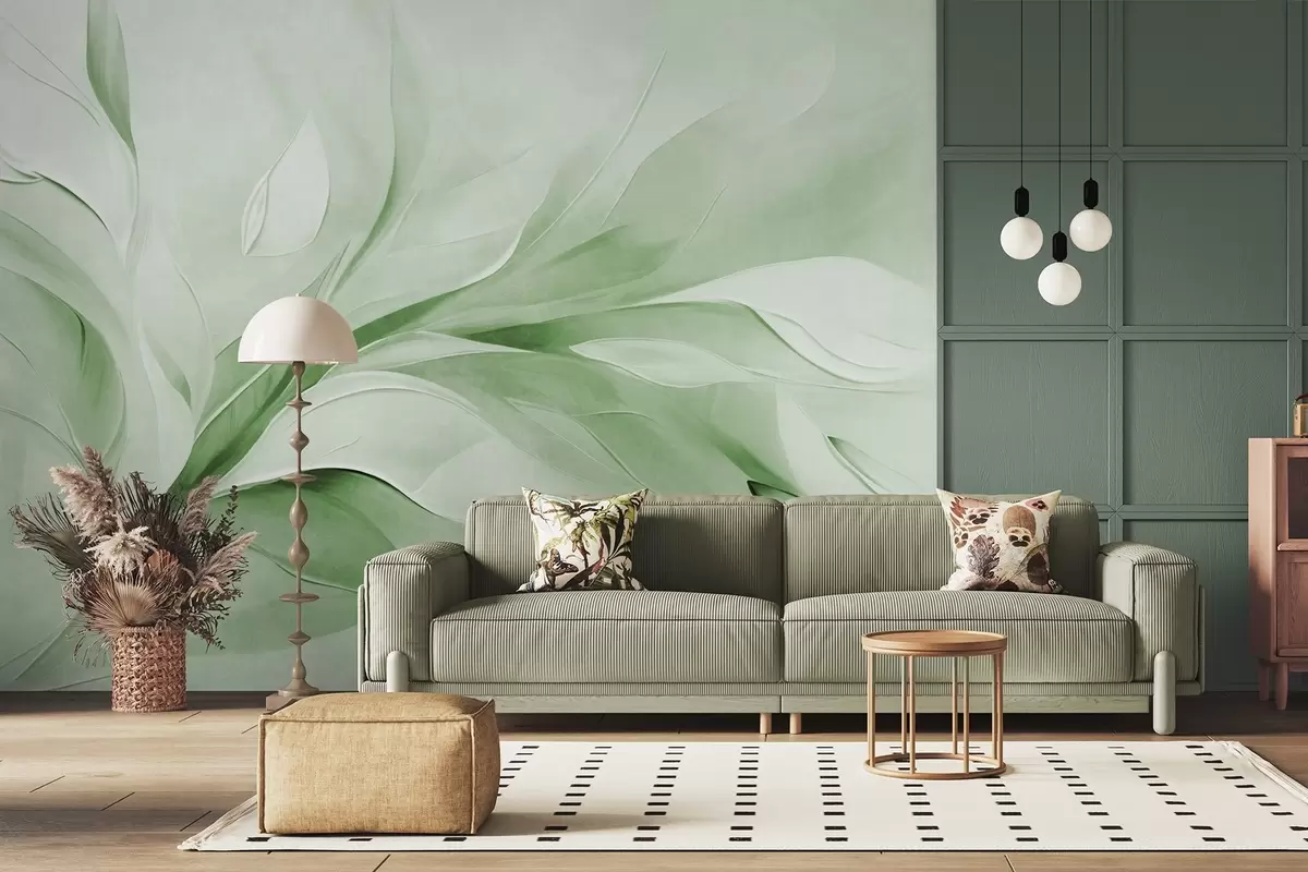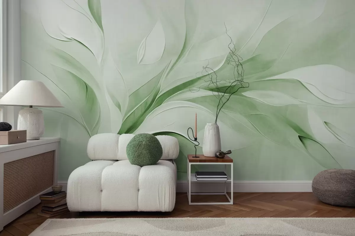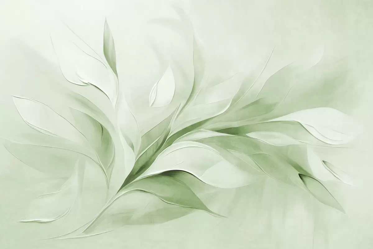 Fotomurales Estilo pictórico abstracto con textura de hojas verdes y blancas que fluyen. Nr. w09765v2