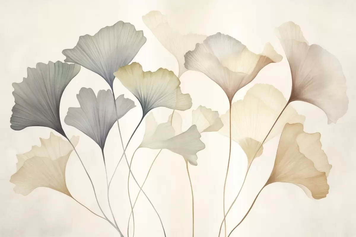 Fotomurales Hoja de ginkgo abstracta en tonos pastel apagados, como el azul, el verde y el melocotón; obra de arte con textura Nr. w09810