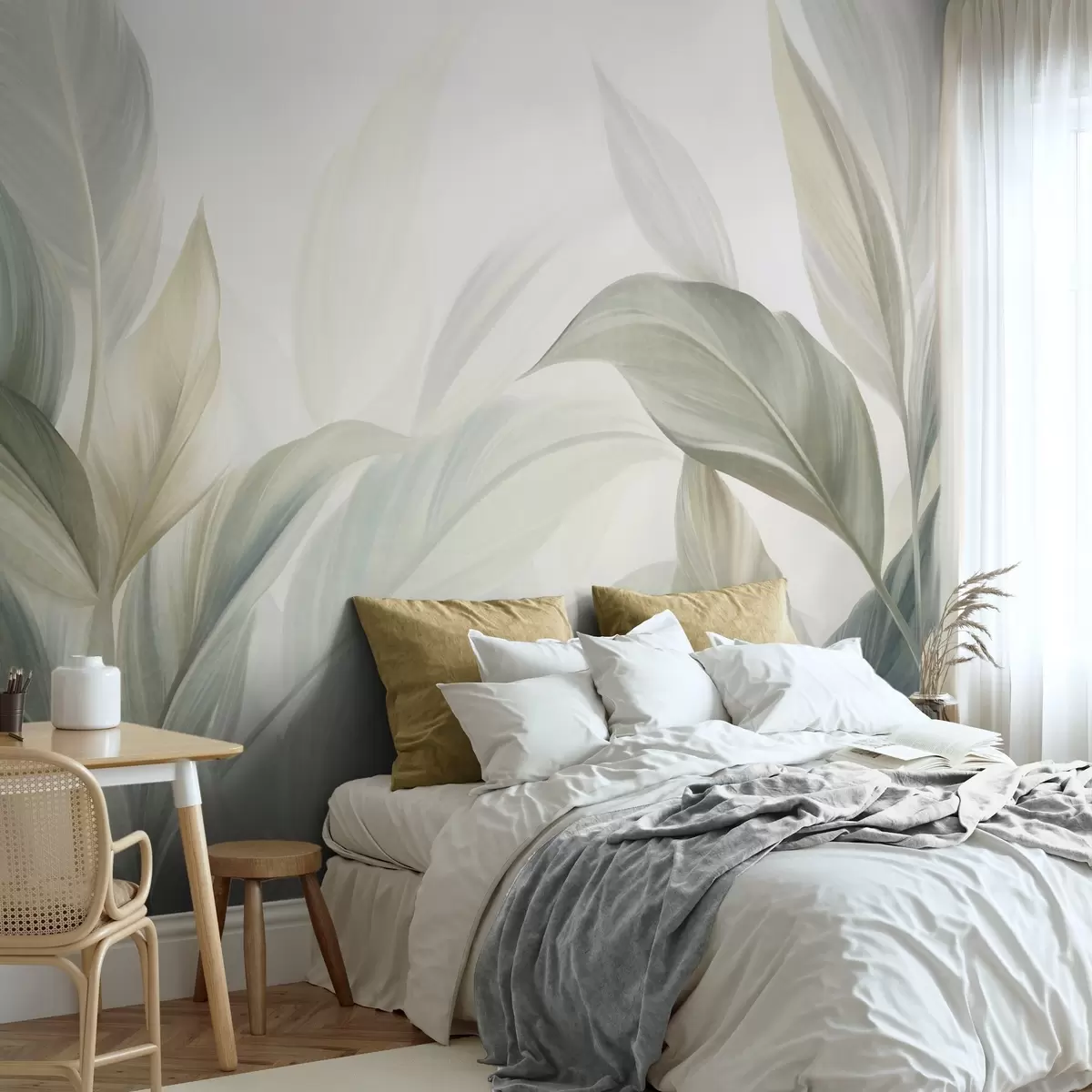Fotomurales Hojas tropicales grandes de color verde pálido con tonos suaves y pasteles, obra de arte con textura Nr. w09816