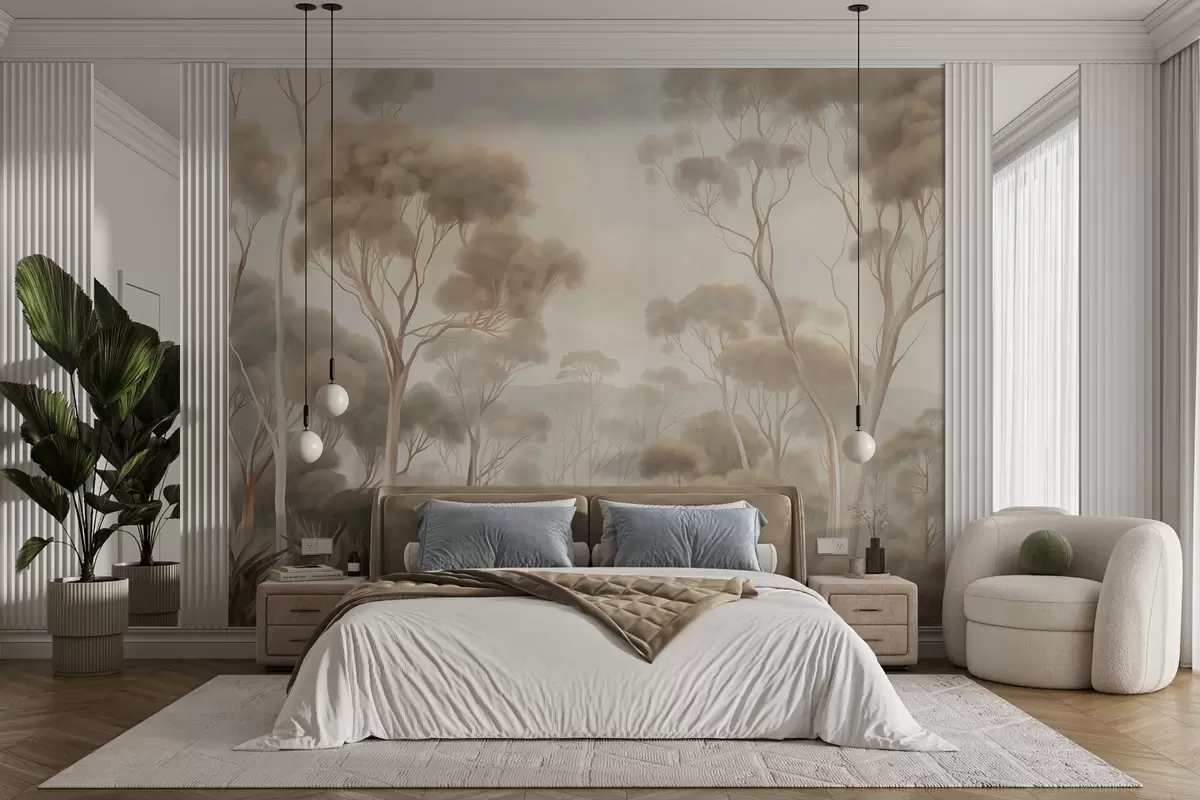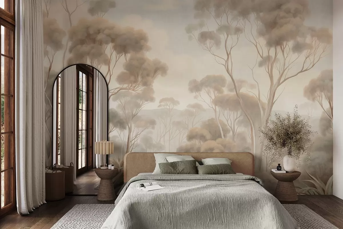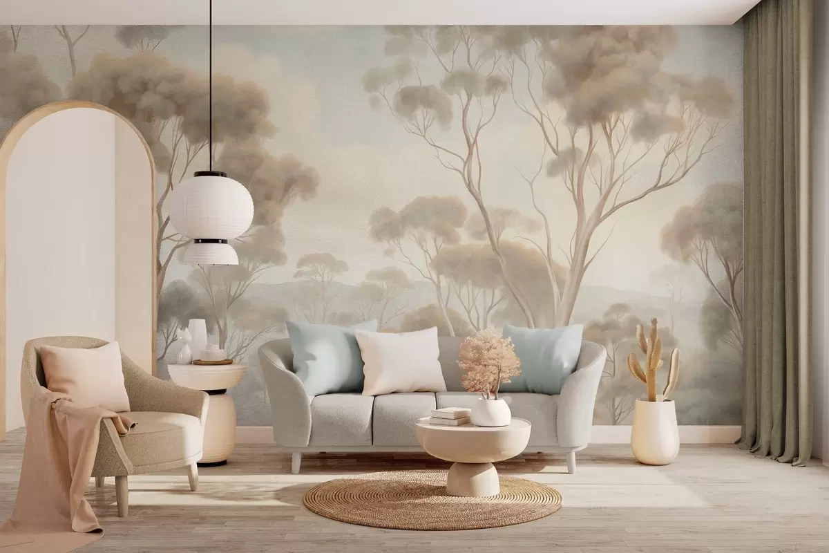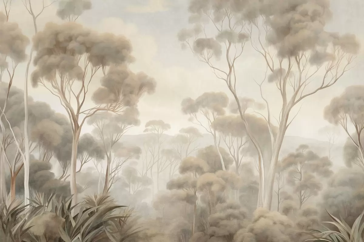 Fotomurales Un paisaje boscoso envuelto en niebla con altos eucaliptos, colinas onduladas bajo un cielo nublado, obra de arte con textura Nr. w09822