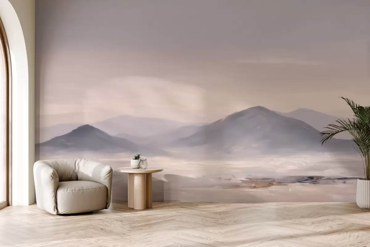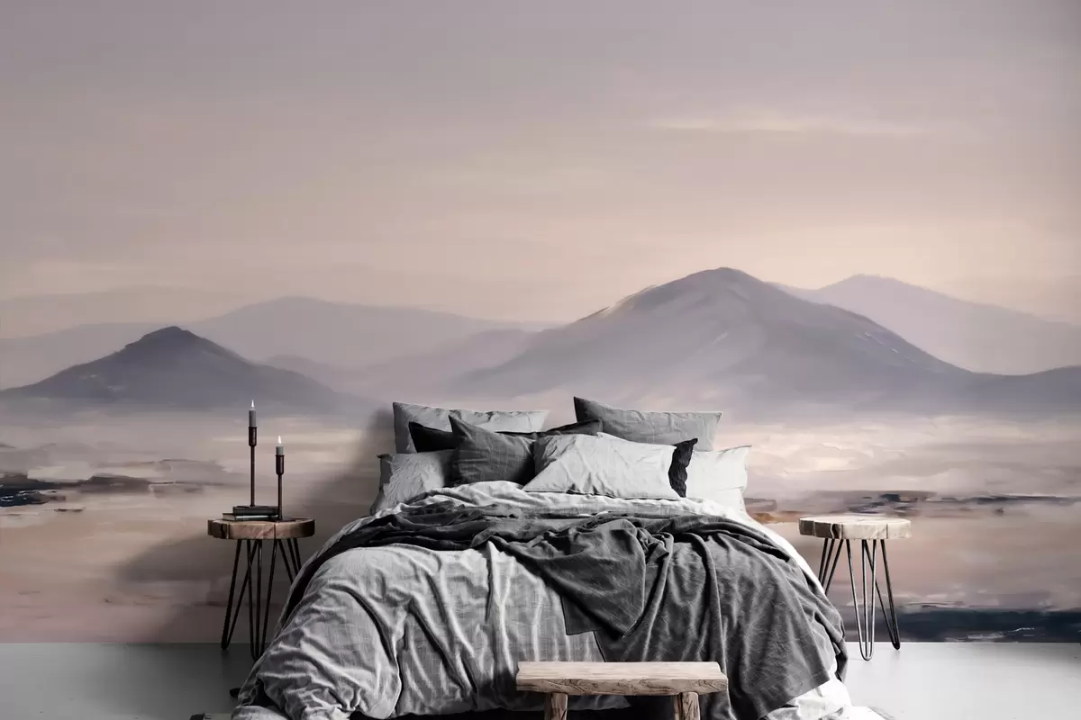 Fotomurales Un paisaje montañoso envuelto en niebla, con suaves transiciones de luz y aire, y un efecto similar al de una máscara Nr. w09844