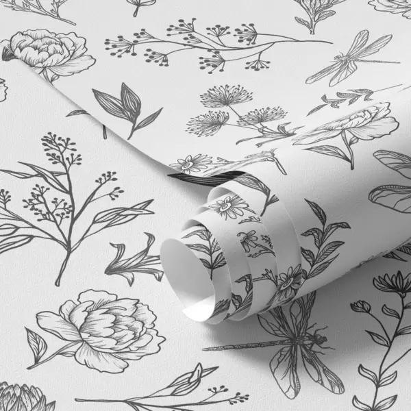 Papel pintado Flores, hojas y libélulas sobre fondo blanco Nr. a00025v1