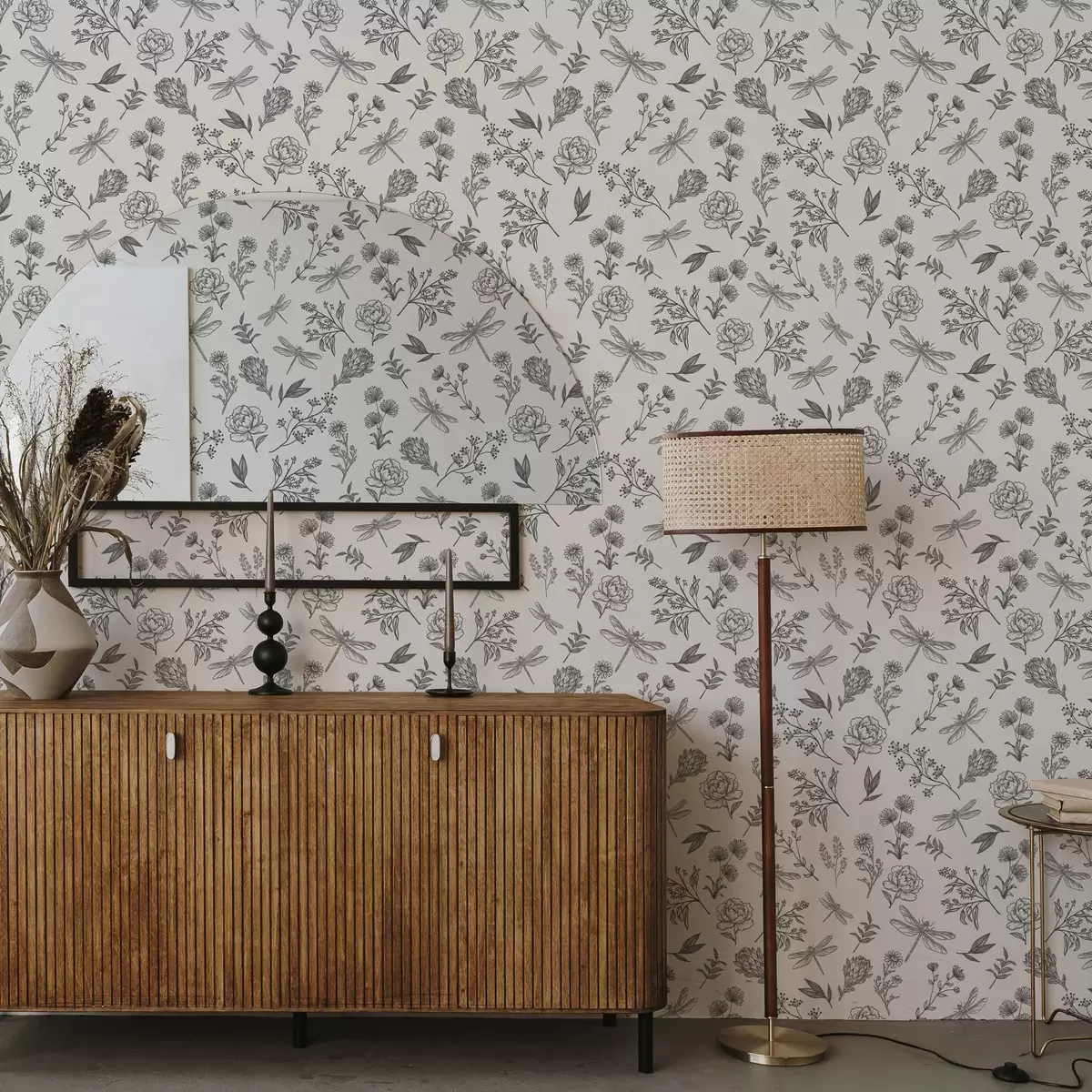 Papel pintado Flores, hojas y libélulas sobre fondo blanco Nr. a00025v1