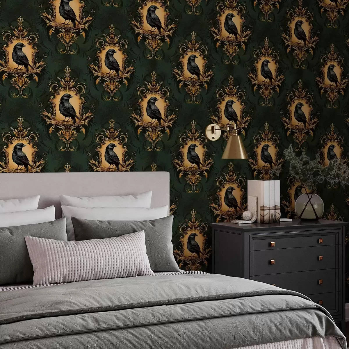 Papel pintado Cuervo en un marco sobre fondo verde Nr. a00105