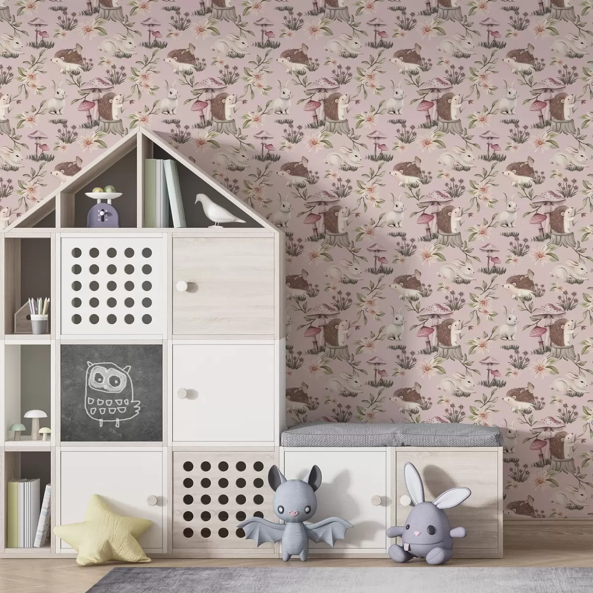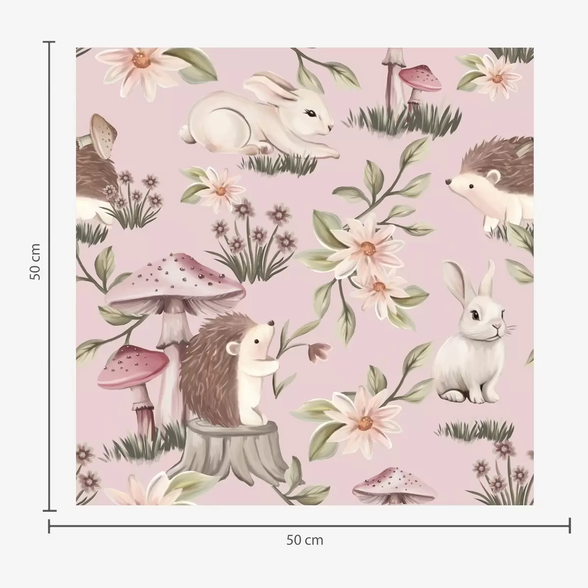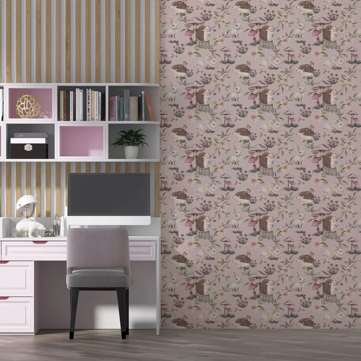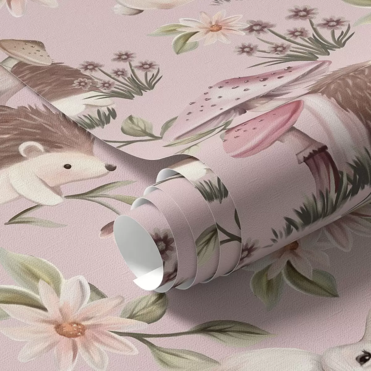 Papel pintado Erizos, conejos y flores de cuento de hadas entre setas sobre fondo rosa Nr. a00111