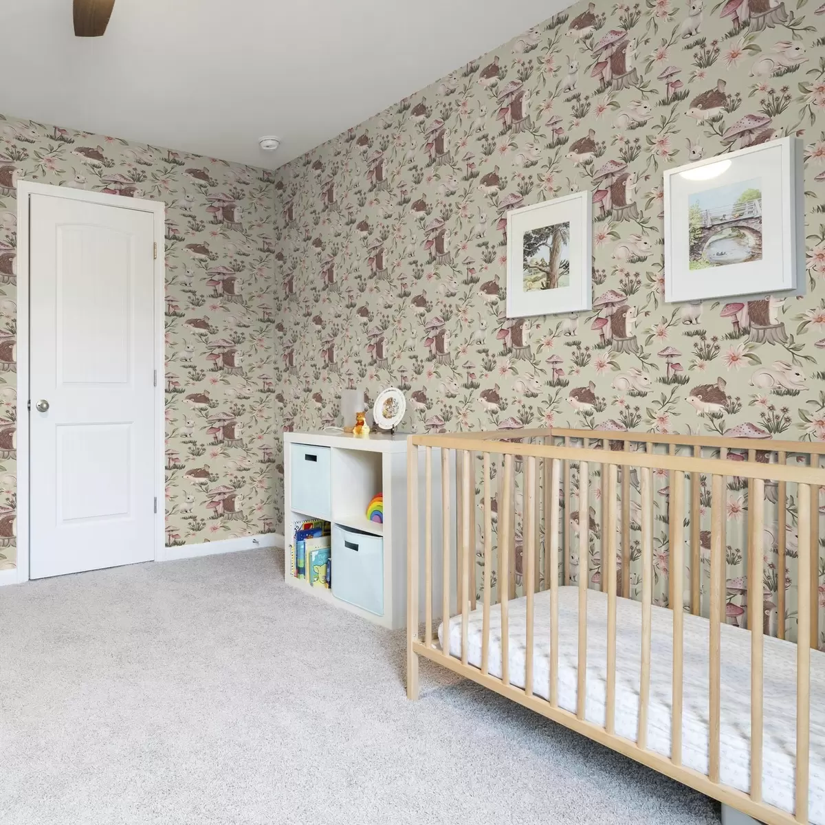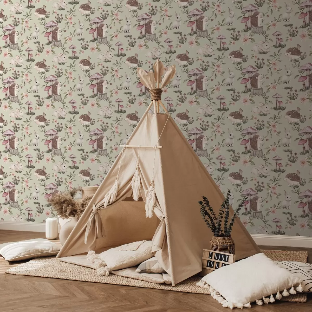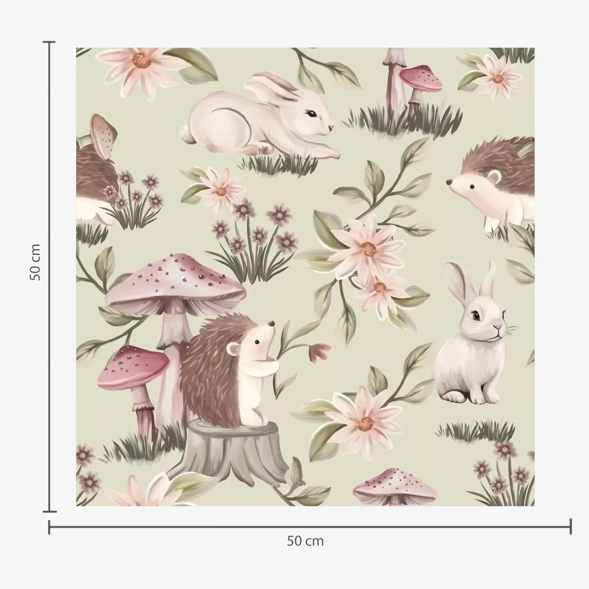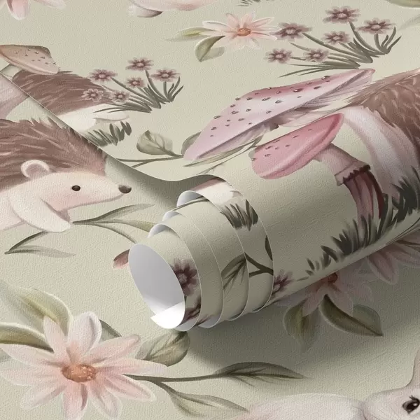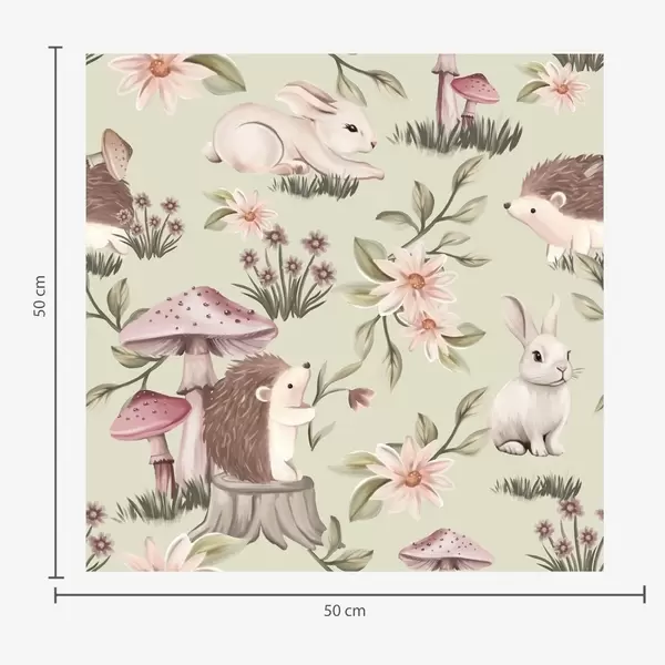 Papel pintado Animales y flores de cuento sobre fondo verde en delicados colores pastel Nr. a00111v1