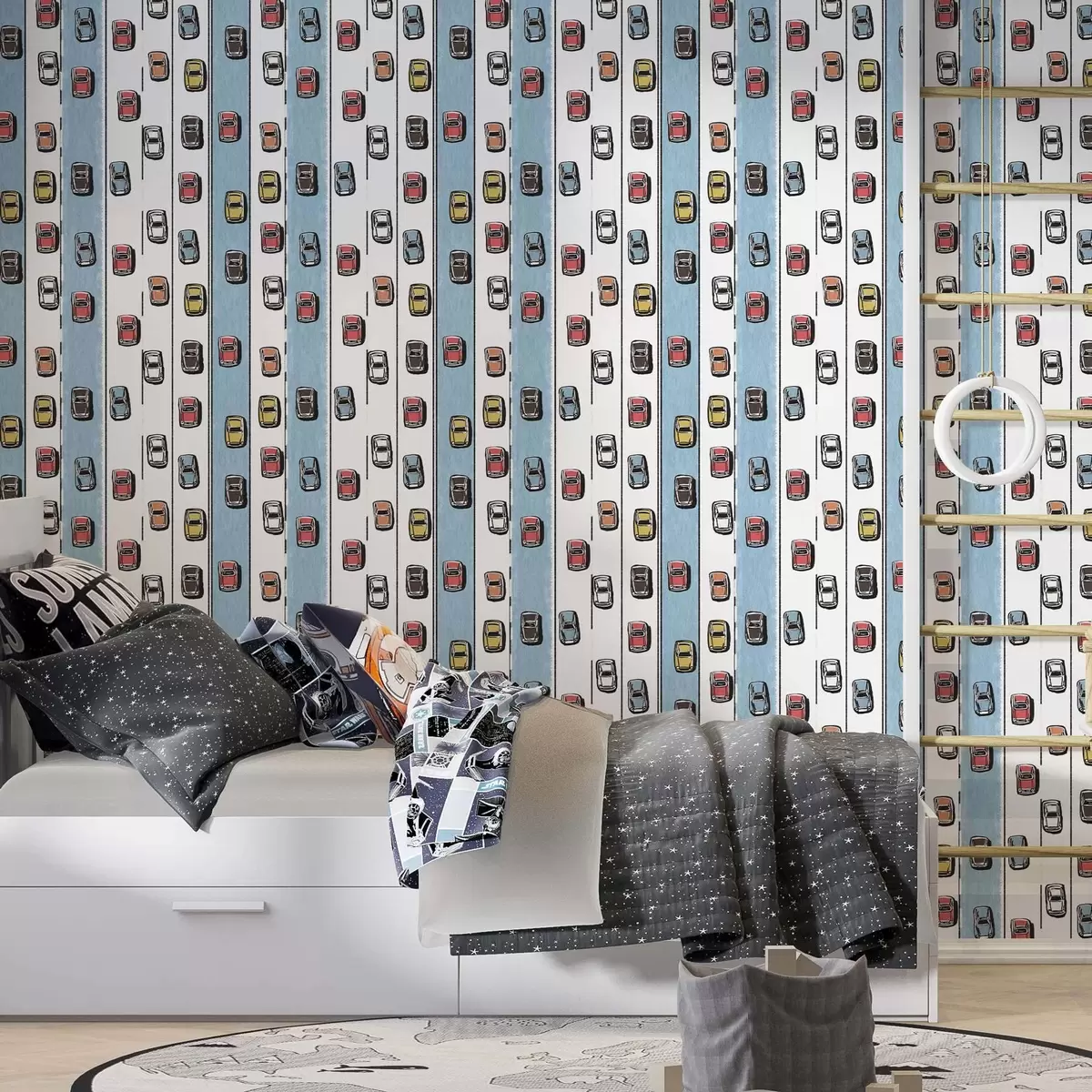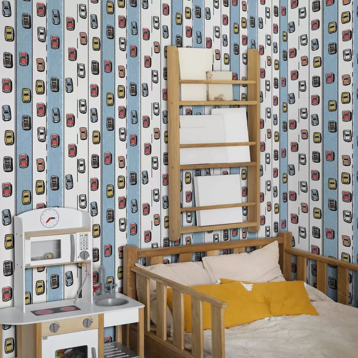 Papel pintado Coche retro en una carretera blanca y azul al estilo de los años 60 Nr. a00118v2