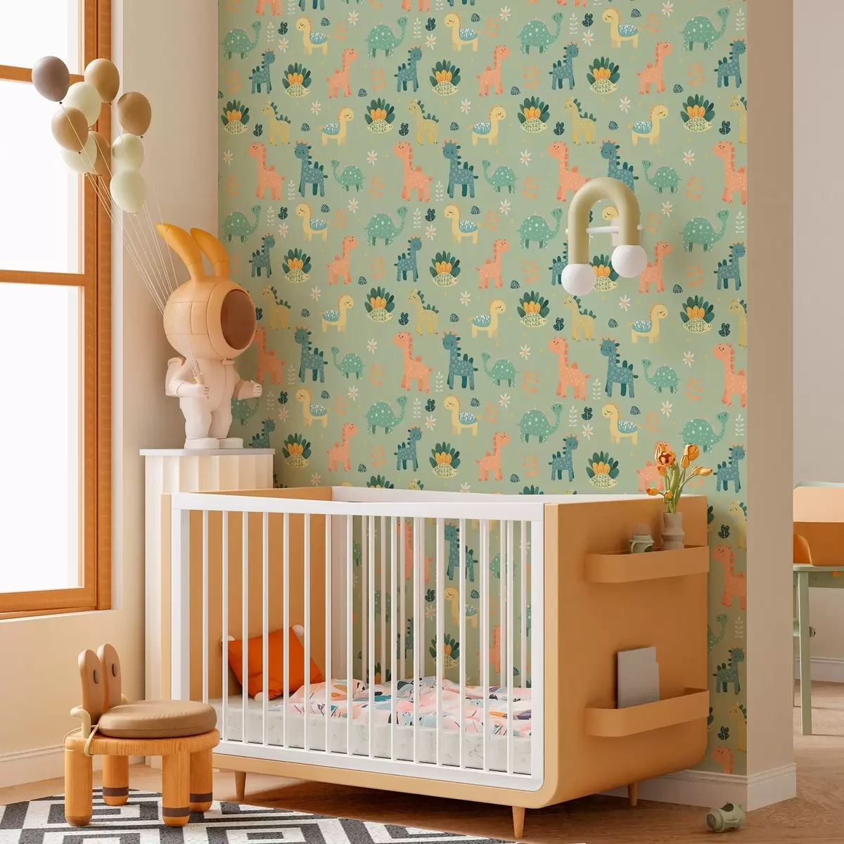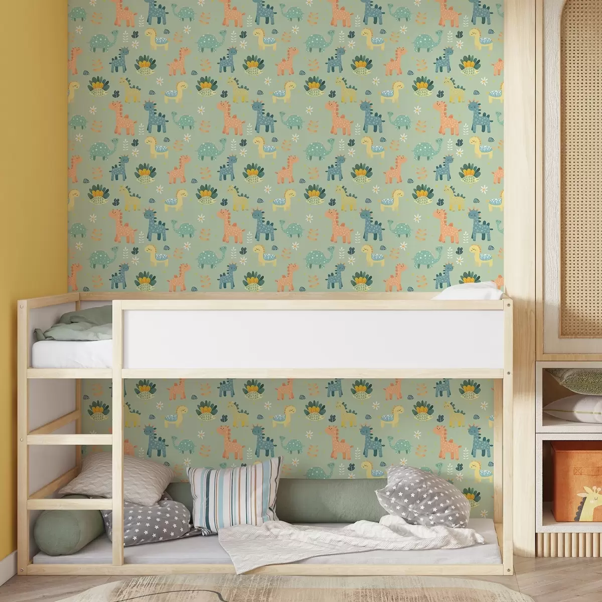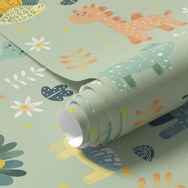 Papel pintado Divertidos dinosaurios en una suave paleta verde sobre fondo claro Nr. a00125v1