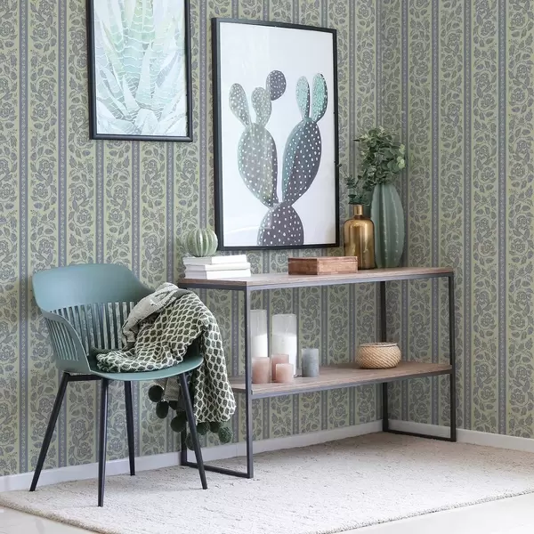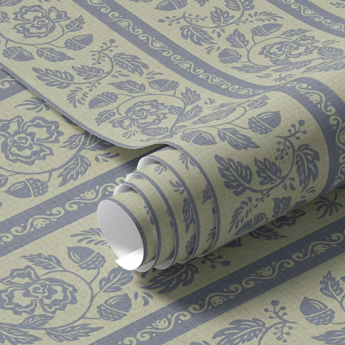 Papel pintado Adorno floral a rayas con bellotas en tonos azules y beige a00181