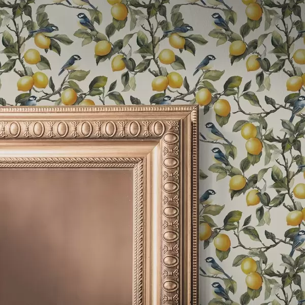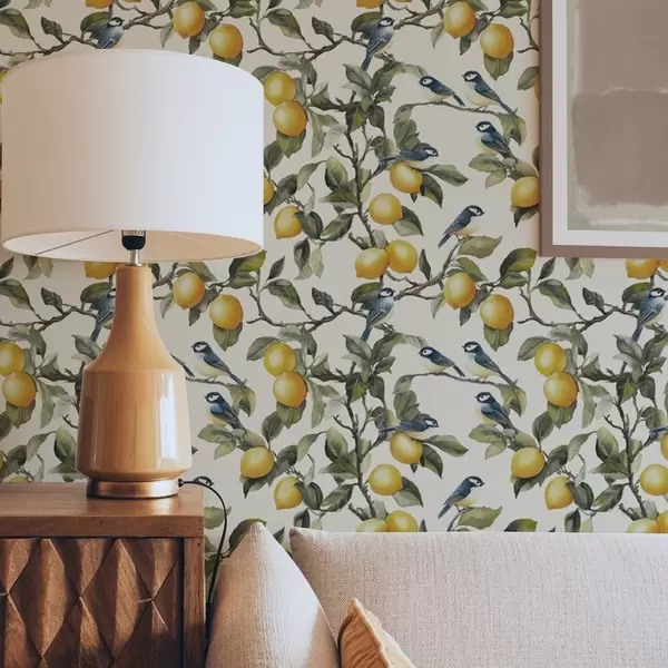 Papel pintado Pájaros y limones en las ramas, dibujo botánico en acuarela Nr. a00207