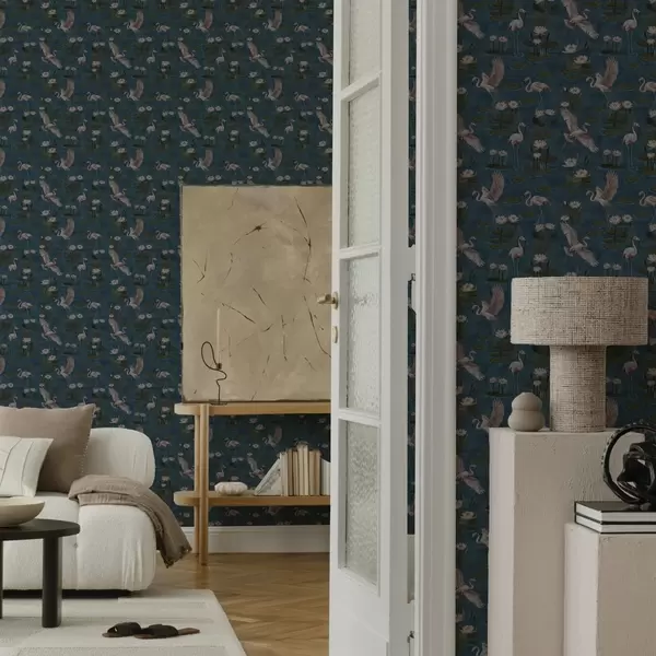 Papel pintado Flamenco entre nenúfares, escena tropical sobre fondo azul marino Nr. a00237