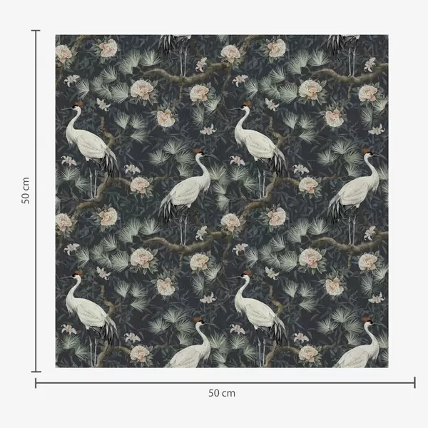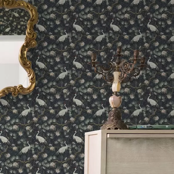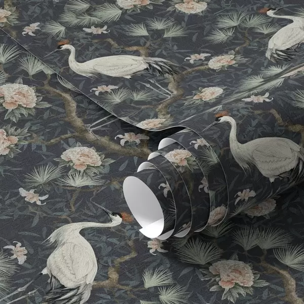 Papel pintado Grullas entre pinos y peonías sobre fondo oscuro Nr. a00241