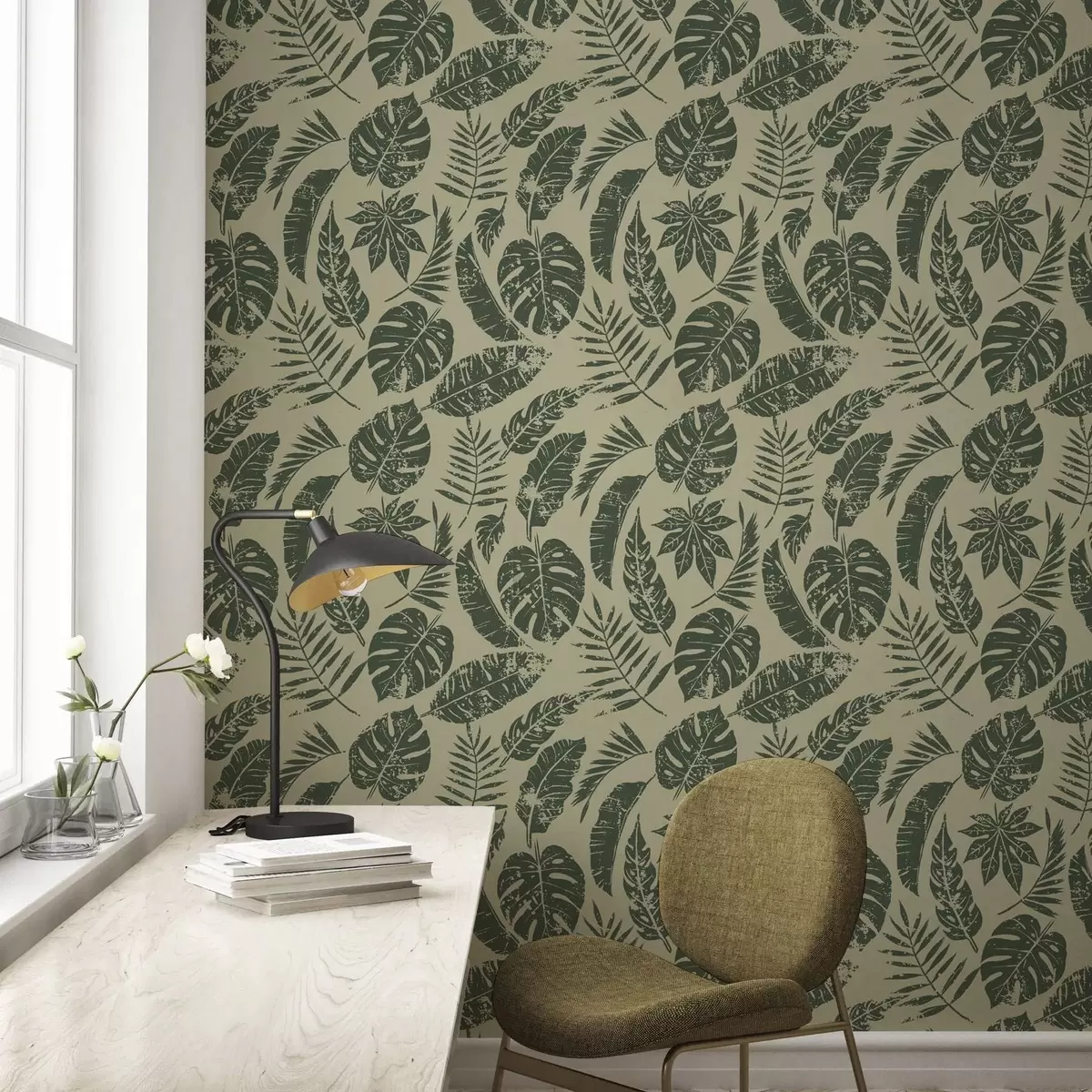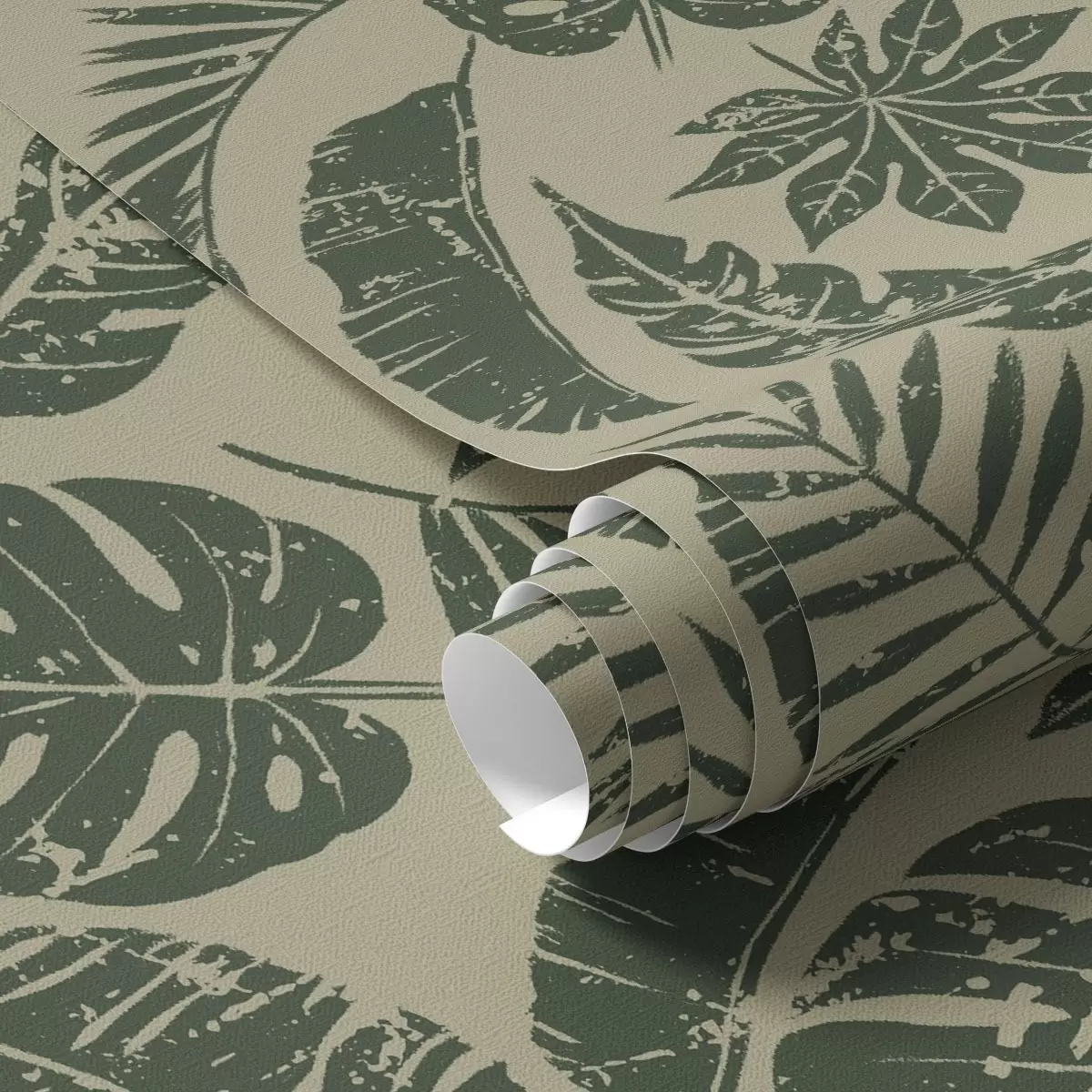 Papel pintado Hojas tropicales en linograbado, verde sobre amarillo a00274