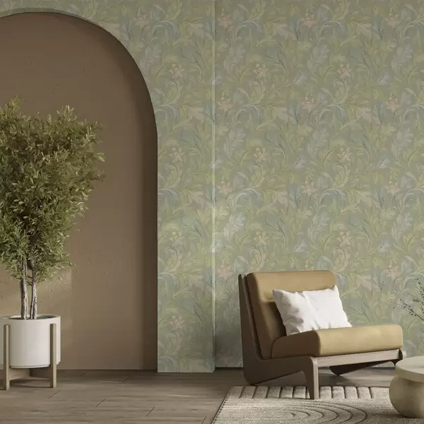 Papel pintado Hojas vintage sobre fondo verde, colores pastel Nr. a00277