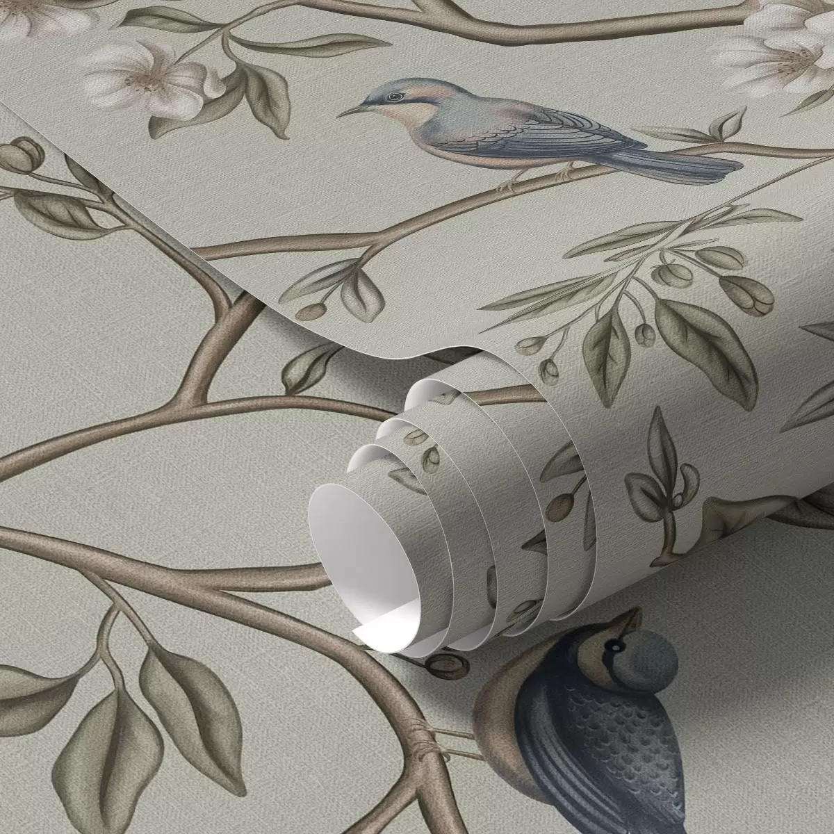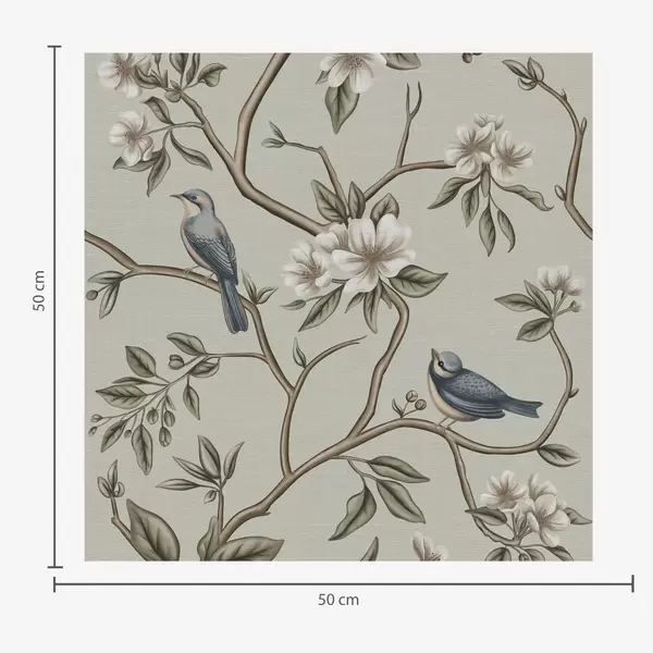 Papel pintado Ramas con pájaros y flores blancas sobre un fondo delicado Nr. a00303