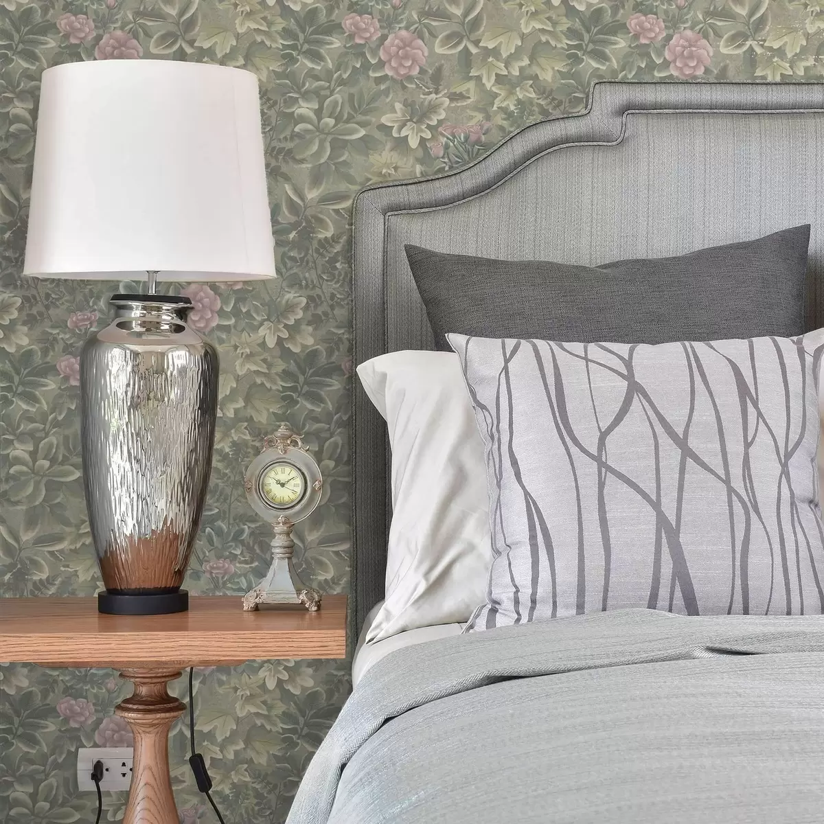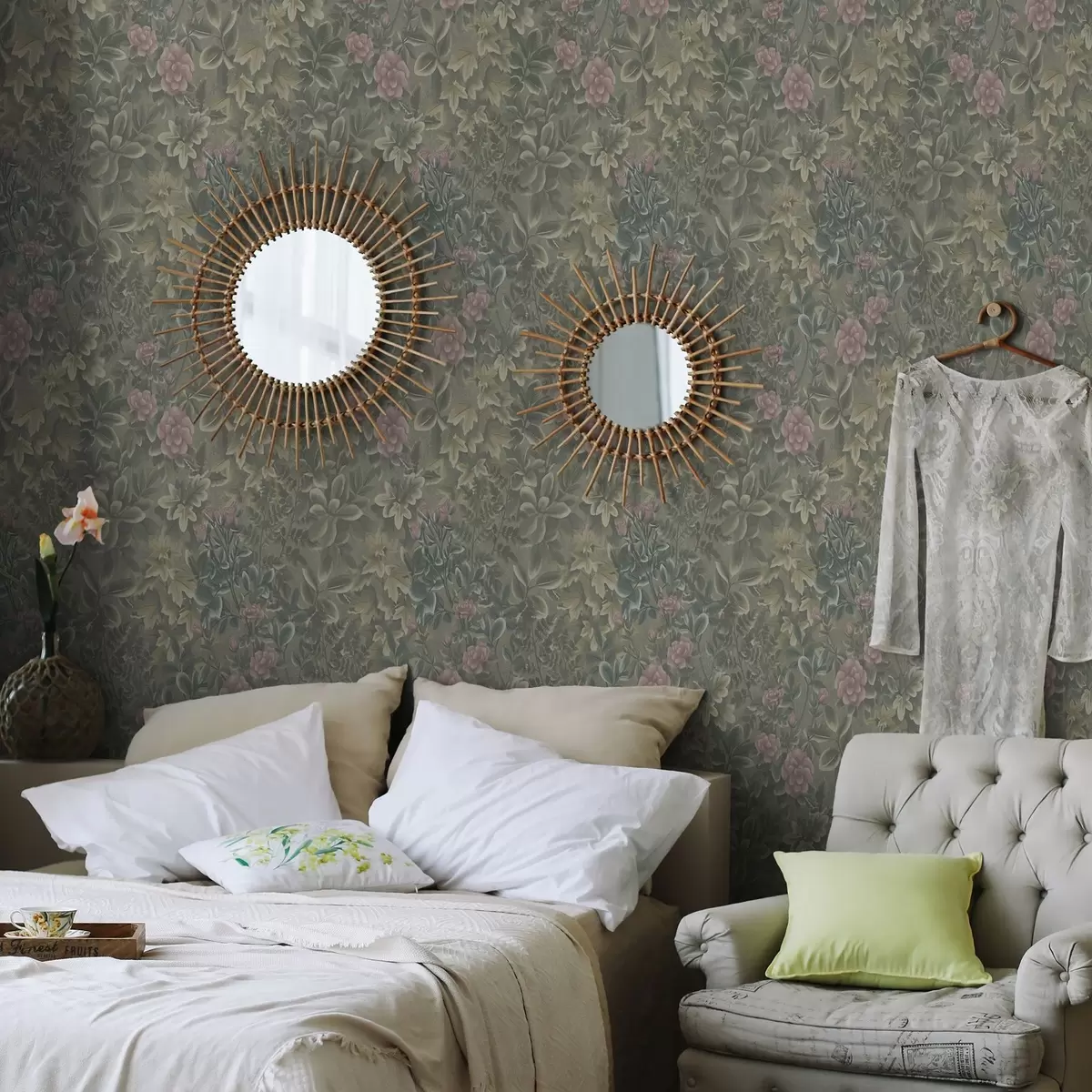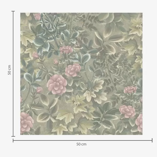 Papel pintado Flores y hojas rosas sobre fondo verde pastel Nr. a00306