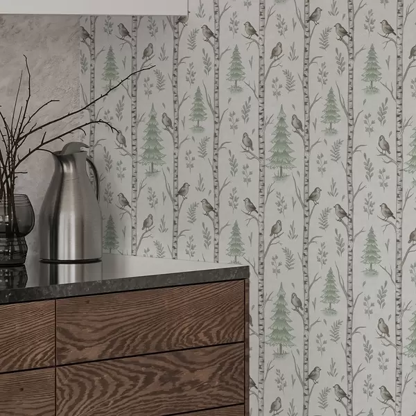Papel pintado Abedules con pájaros en un bosque verde claro Nr. a00316