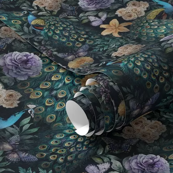 Papel pintado Pavos reales entre flores oscuras y mariposas Nr. a00348