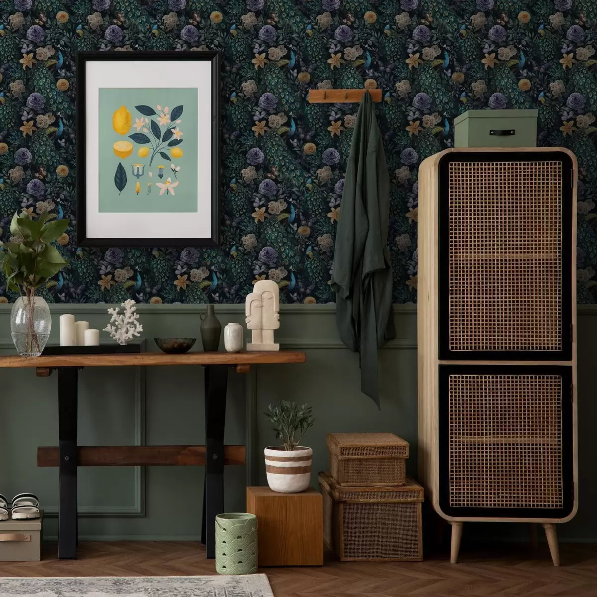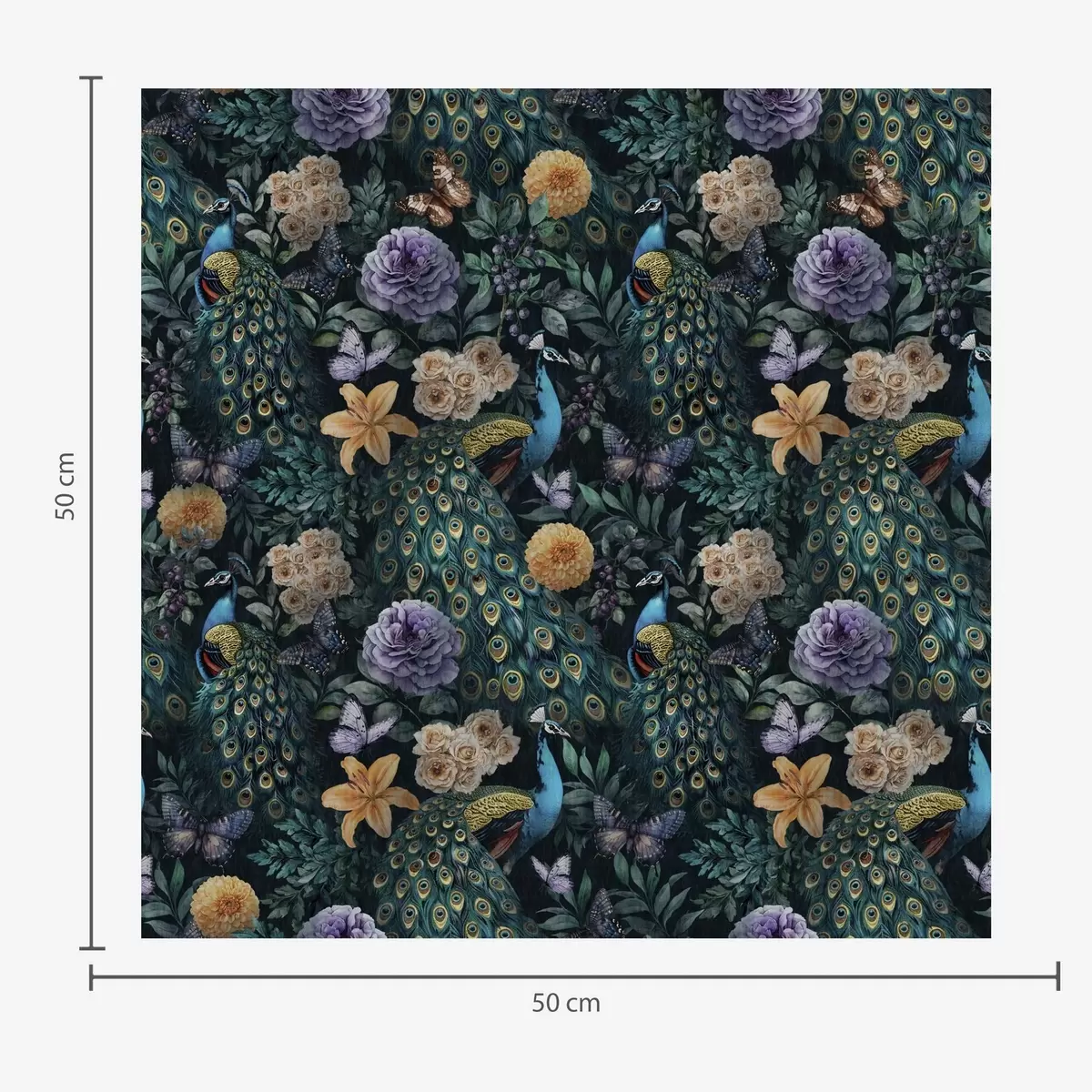 Papel pintado Pavos reales entre flores oscuras y mariposas Nr. a00348
