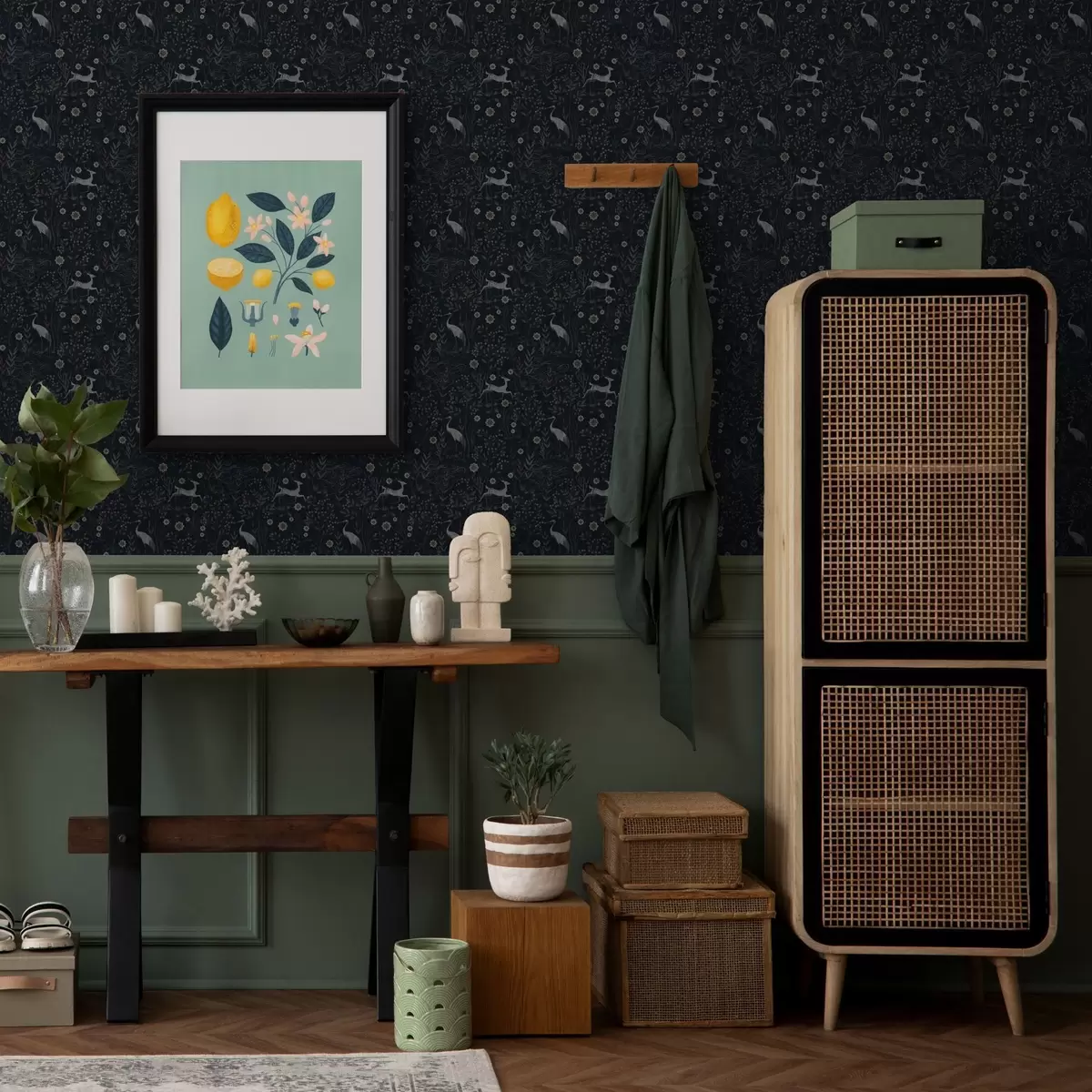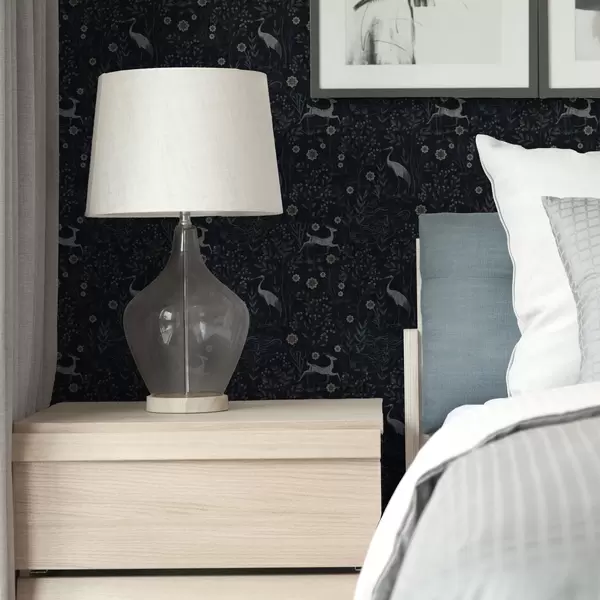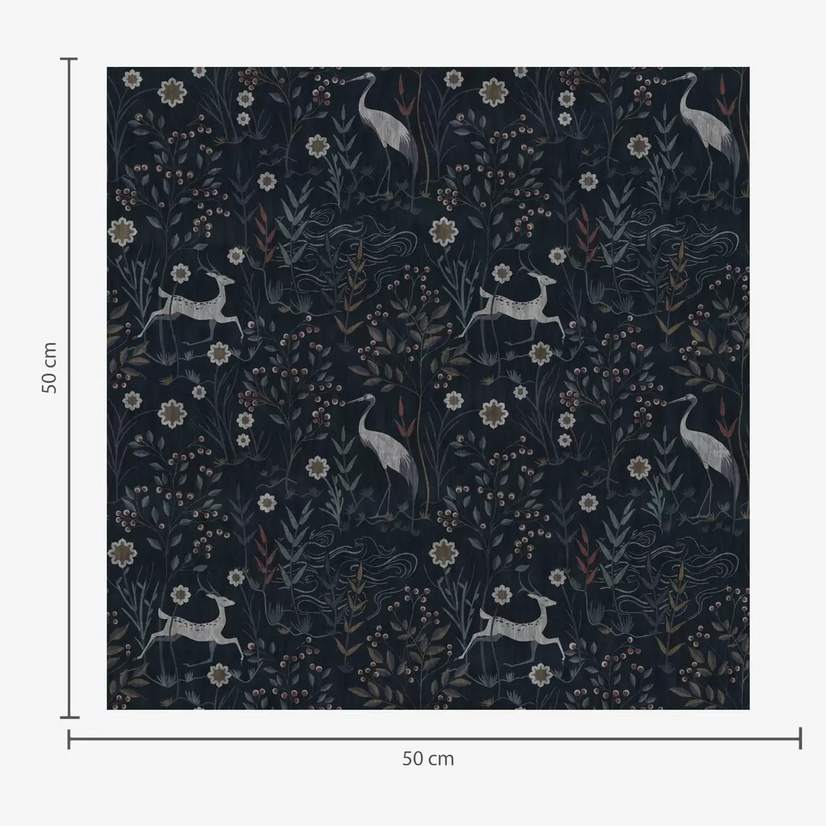Papel pintado Fondo oscuro con pájaros y ciervos blancos Nr. a00363