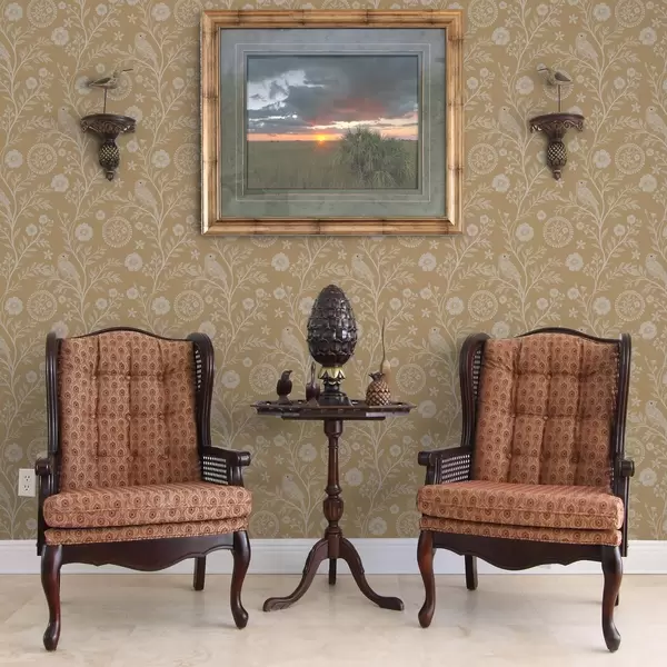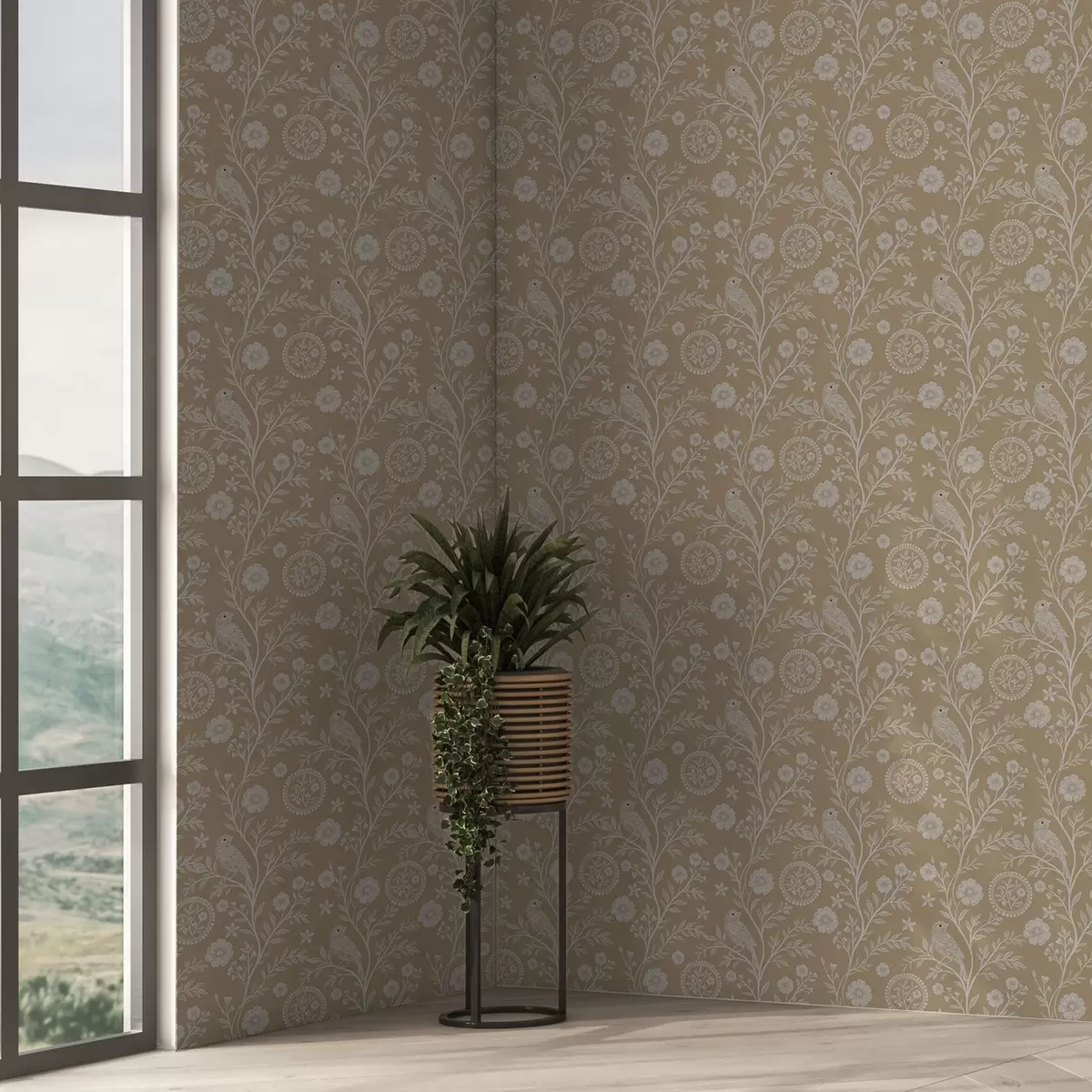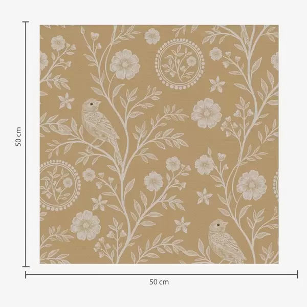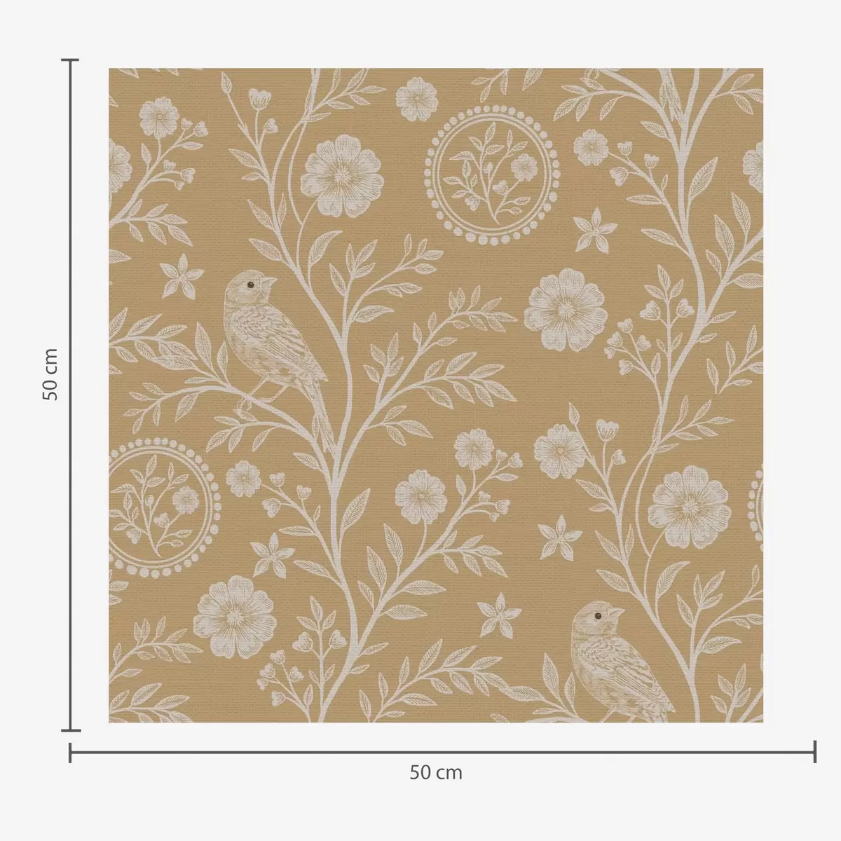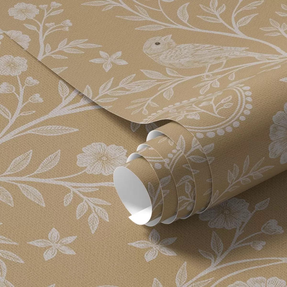 Papel pintado Delicado esbozo de un pájaro y una flor blancos pájaro y flor blancos sobre fondo ocre Nr. a00393