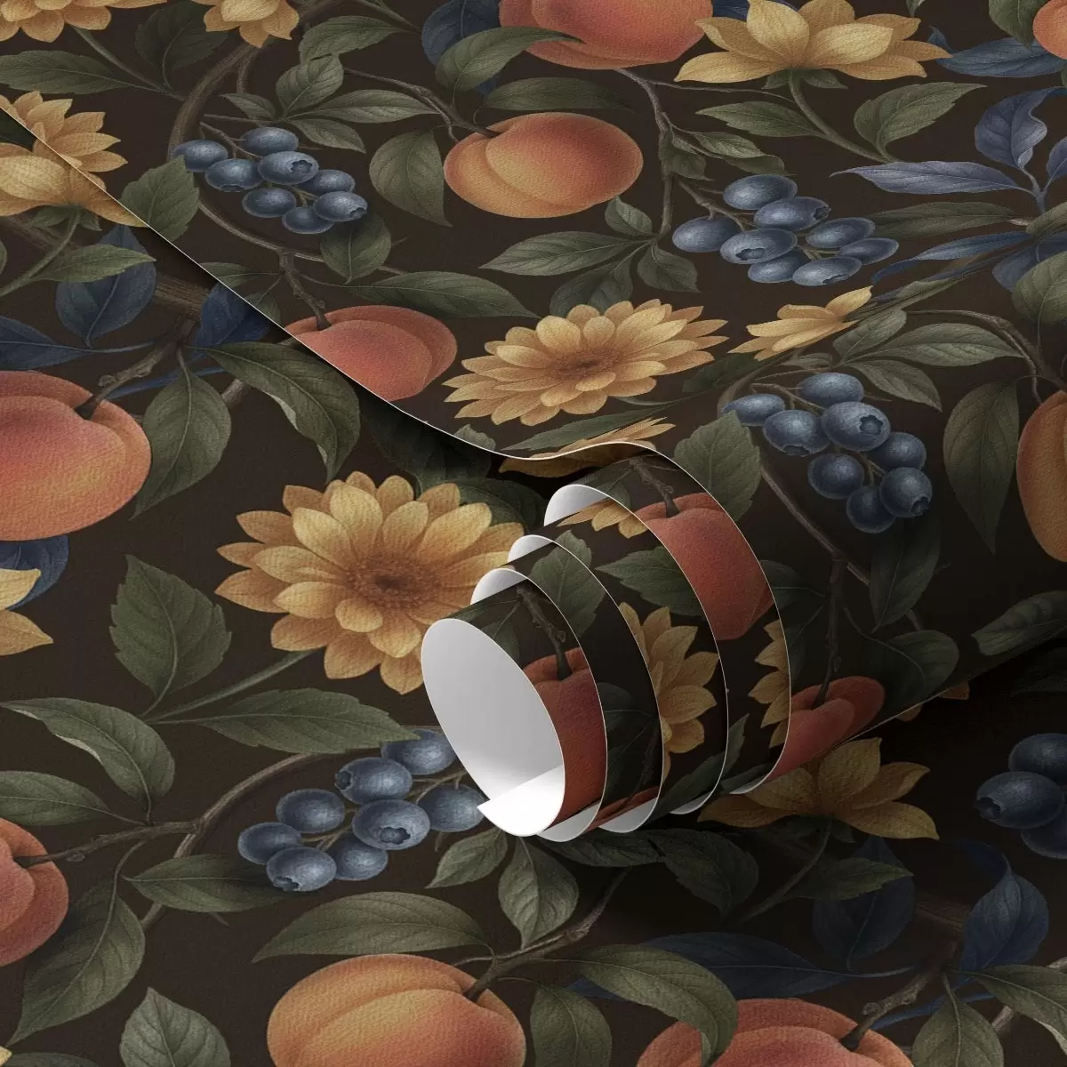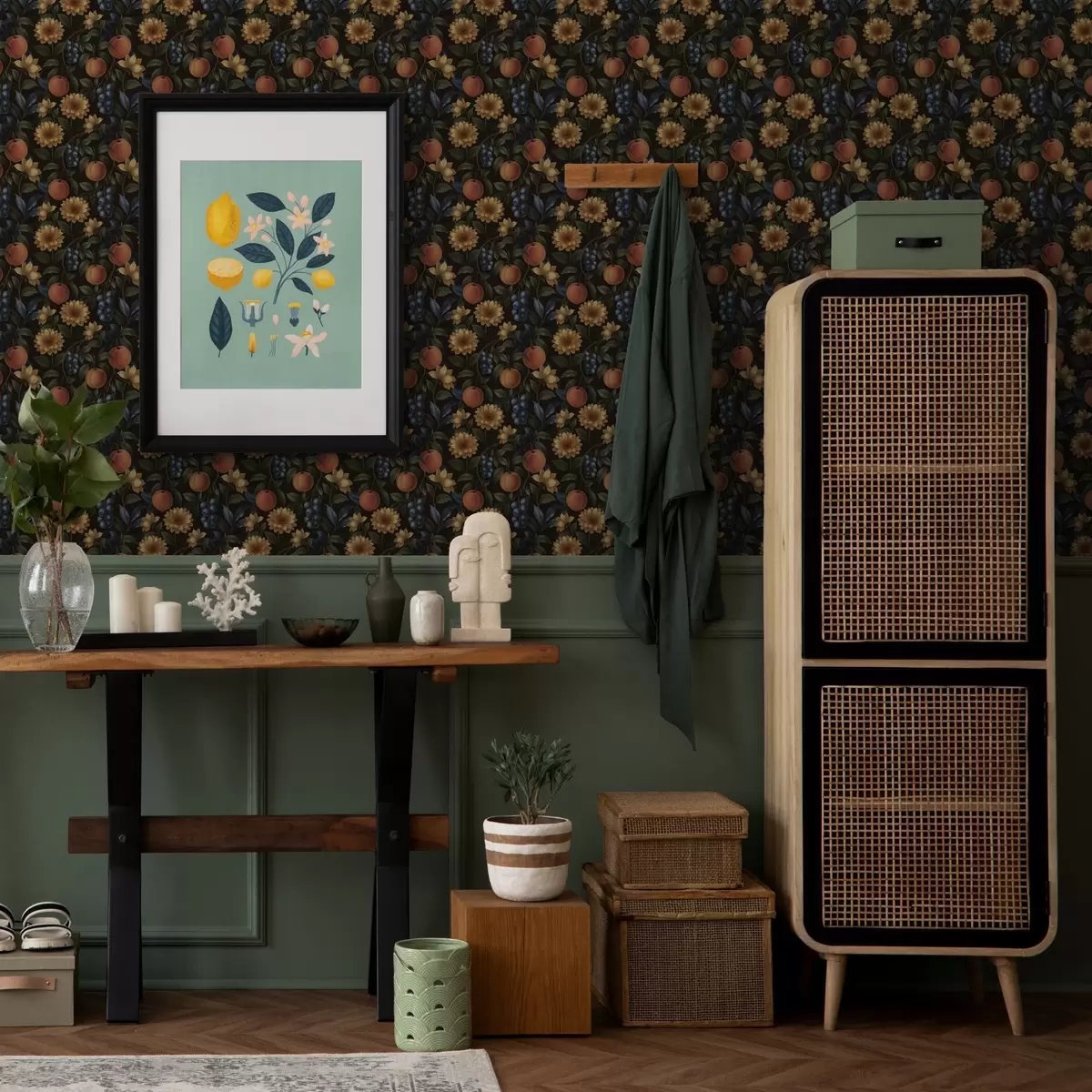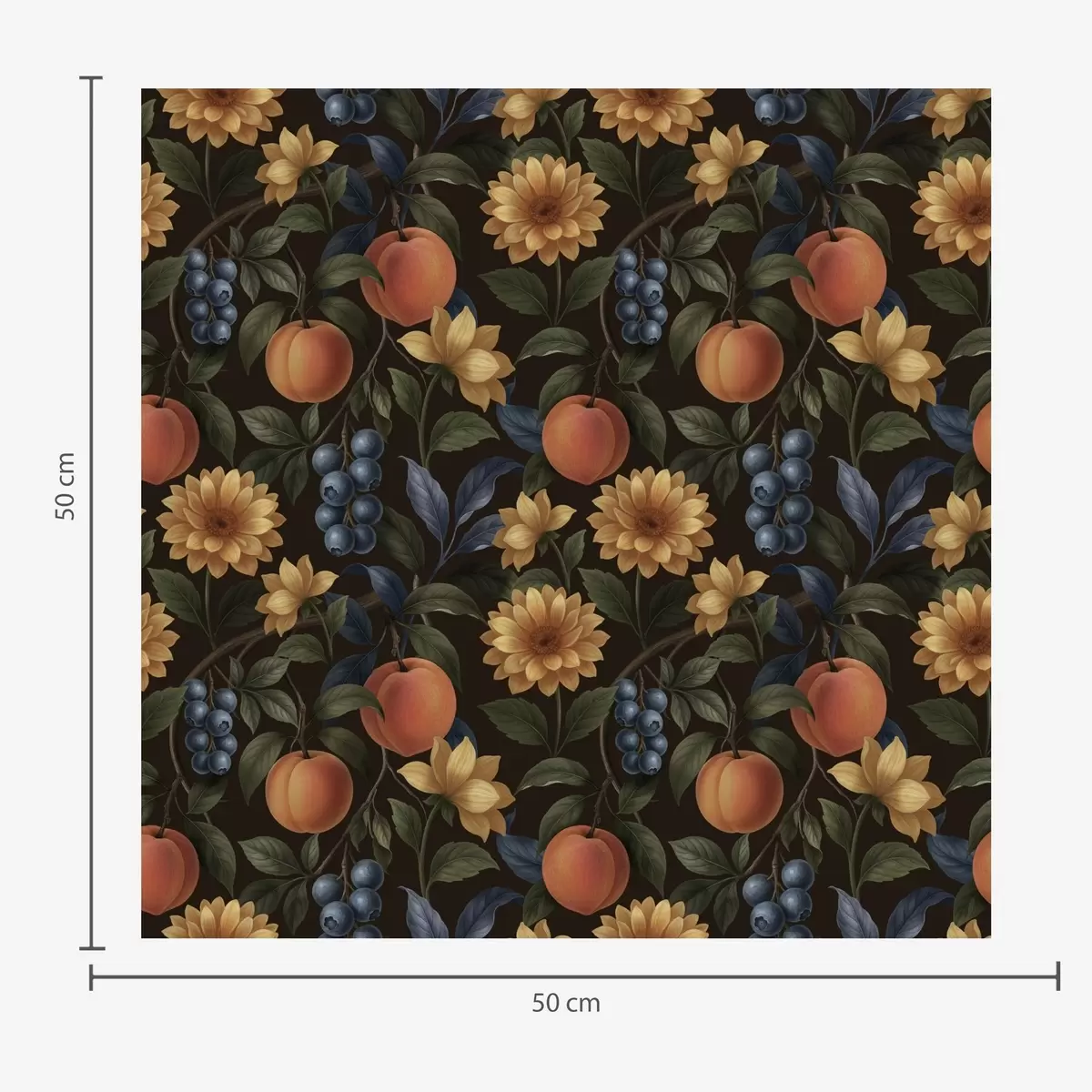 Papel pintado Frutas y flores amarillas sobre fondo botánico oscuro Nr. a00395