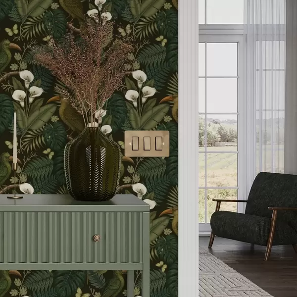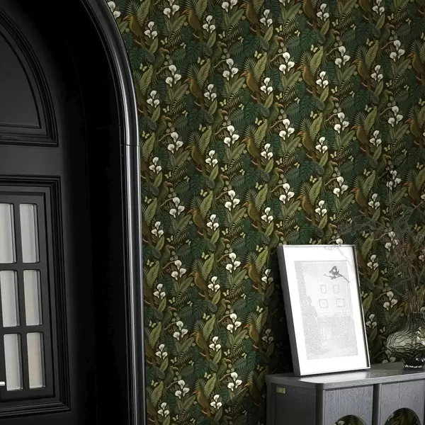 Papel pintado Aves tropicales y exuberante vegetación sobre fondo oscuro de selva Nr. a00397