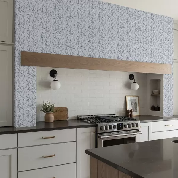 Papel pintado Cerezos en flor azules sobre fondo blanco con suave contraste Nr. a00399