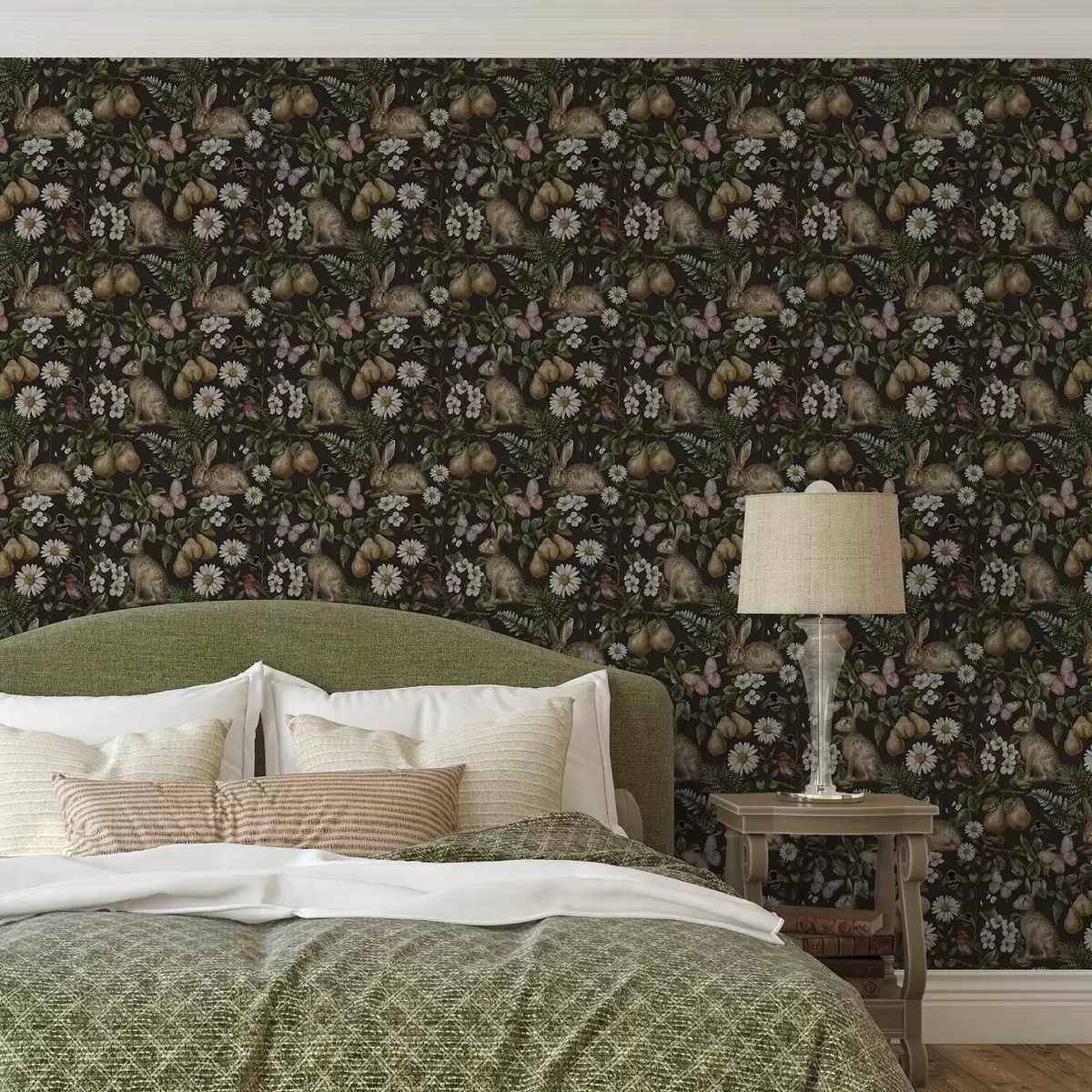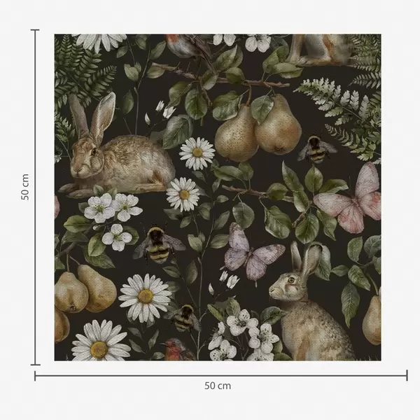 Papel pintado Conejos, peras, flores e insectos realistas sobre fondo oscuro Nr. a00401