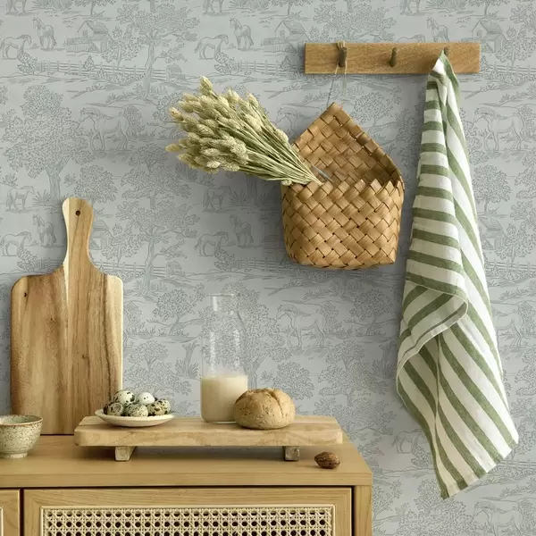 Papel pintado Paisaje verde monocromo con caballos y casitas de campo Nr. a00407