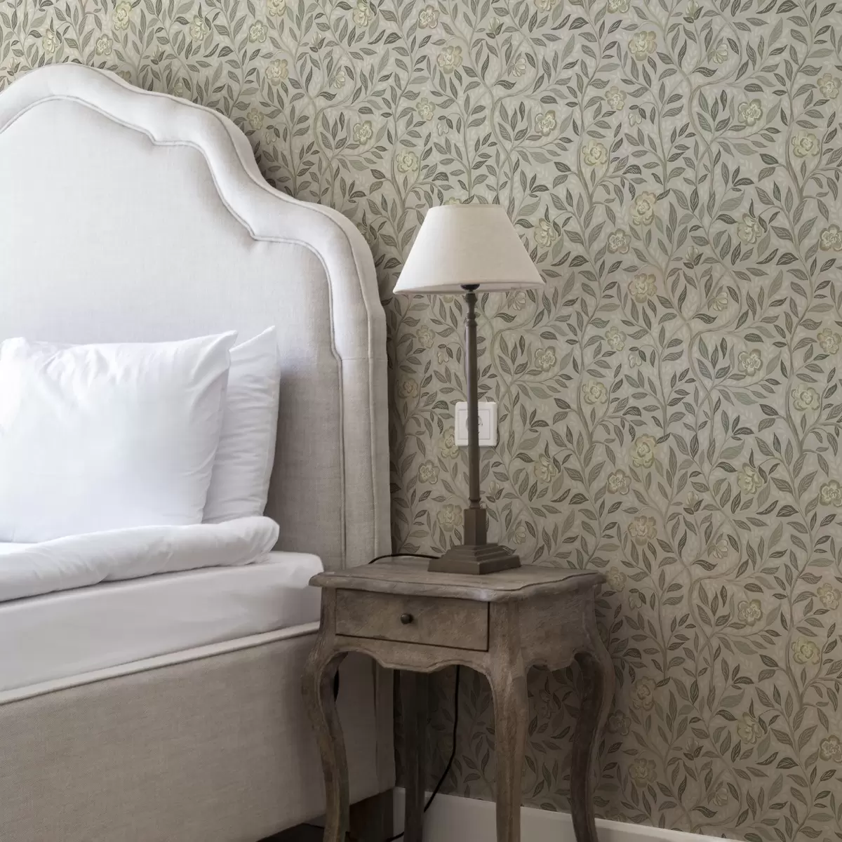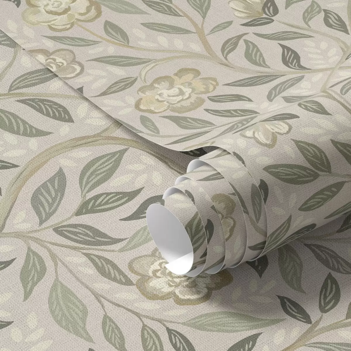Papel pintado Rosas crema y hojas de olivo sobre fondo rosa empolvado Nr. a00455