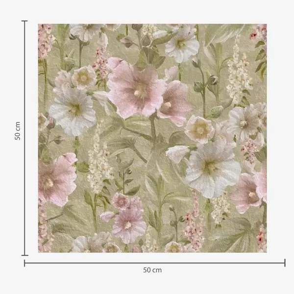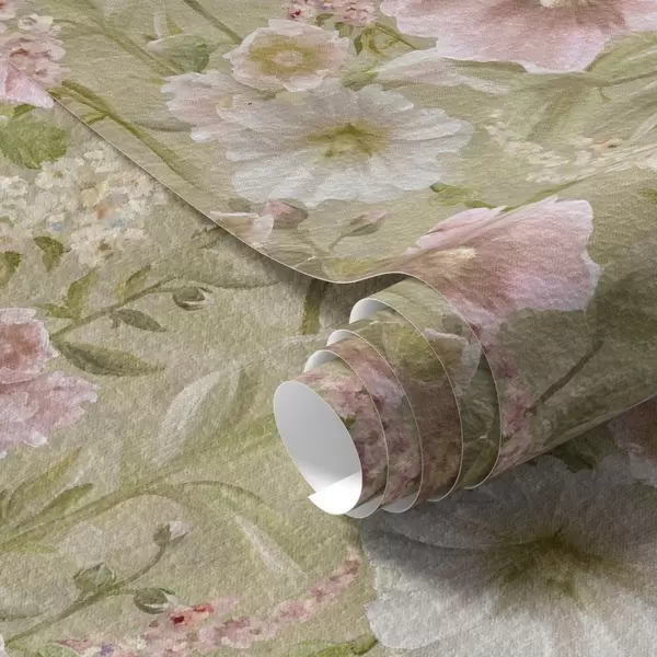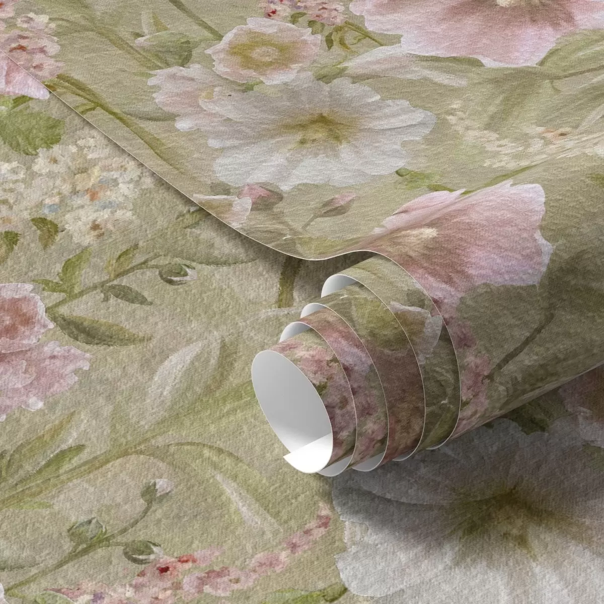 Papel pintado Románticas malvarrosas rosas y blancas sobre un verde apagado Nr. a00456