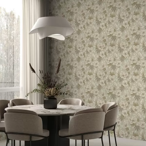Papel pintado Flores color crema sobre fondo verde oliva Nr. a00462