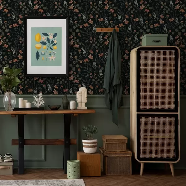 Papel pintado Lirios naranjas y pequeñas flores sobre fondo negro a00463