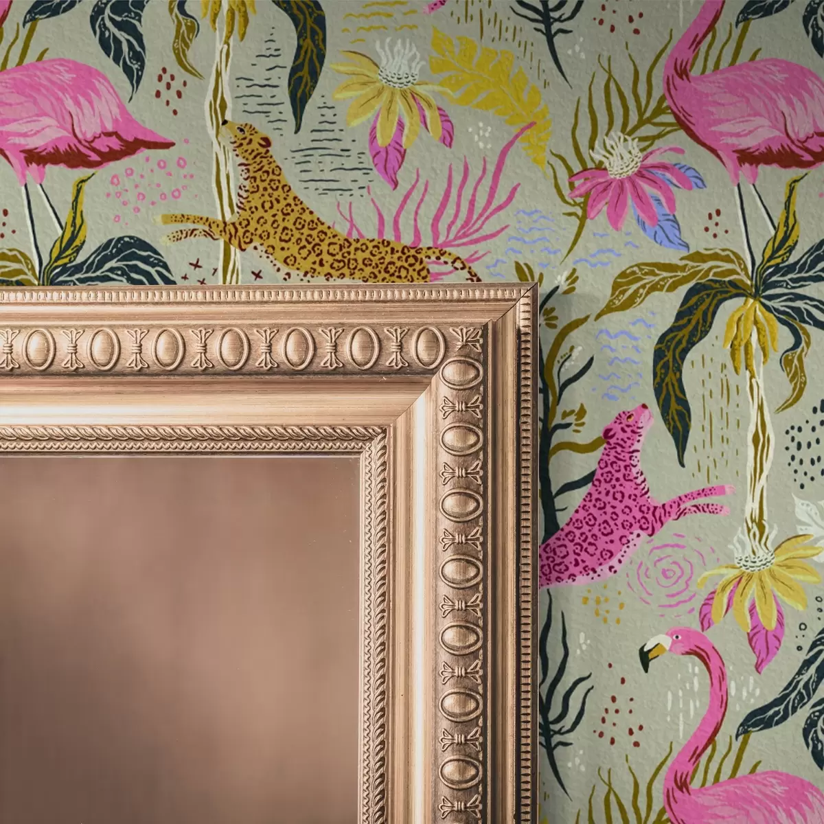 Papel pintado Flamencos y leopardos brillantes entre plantas tropicales a00470
