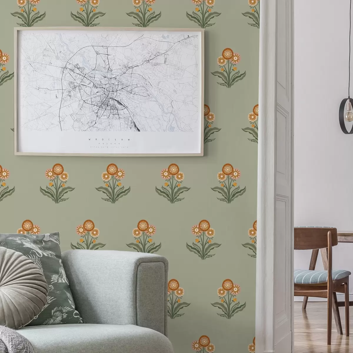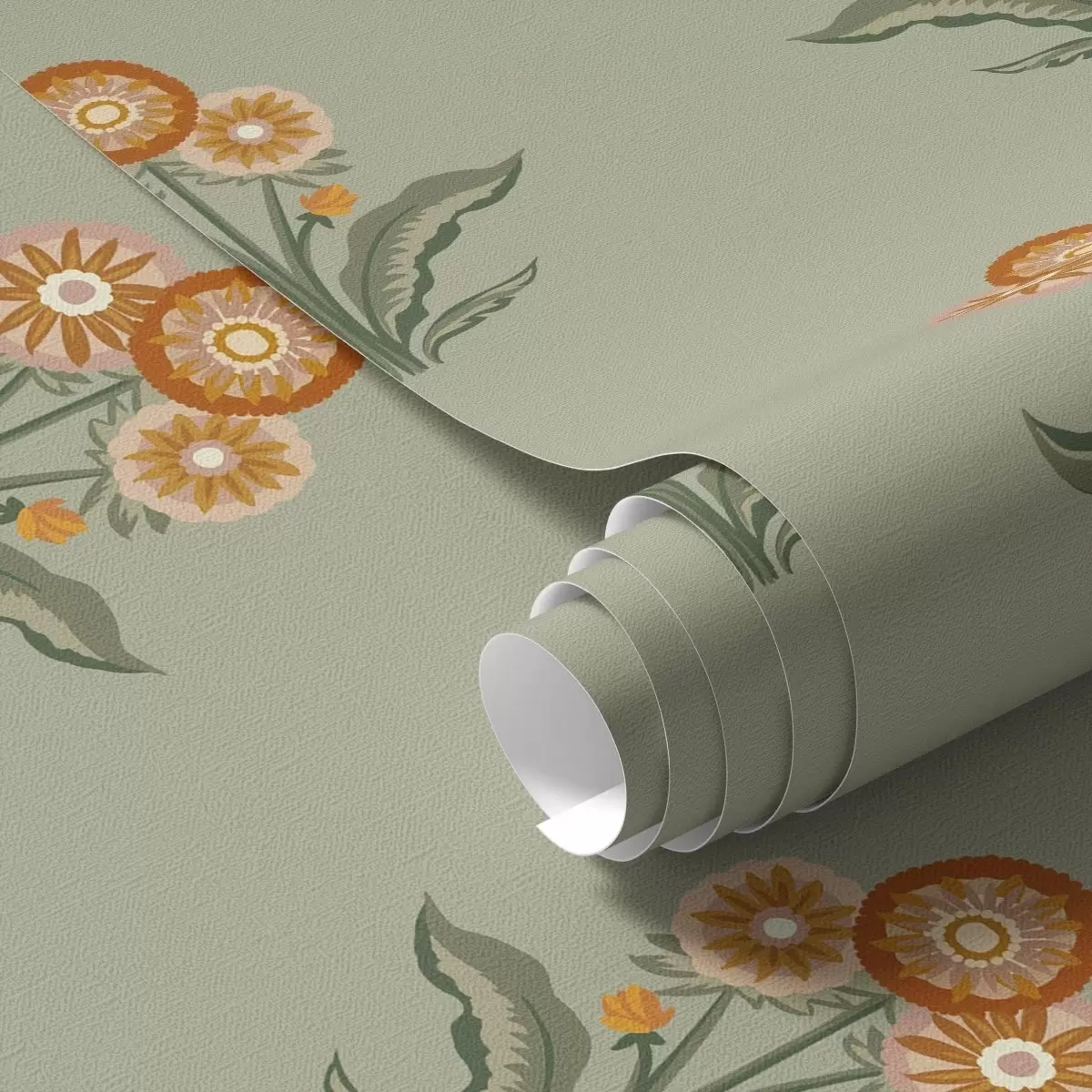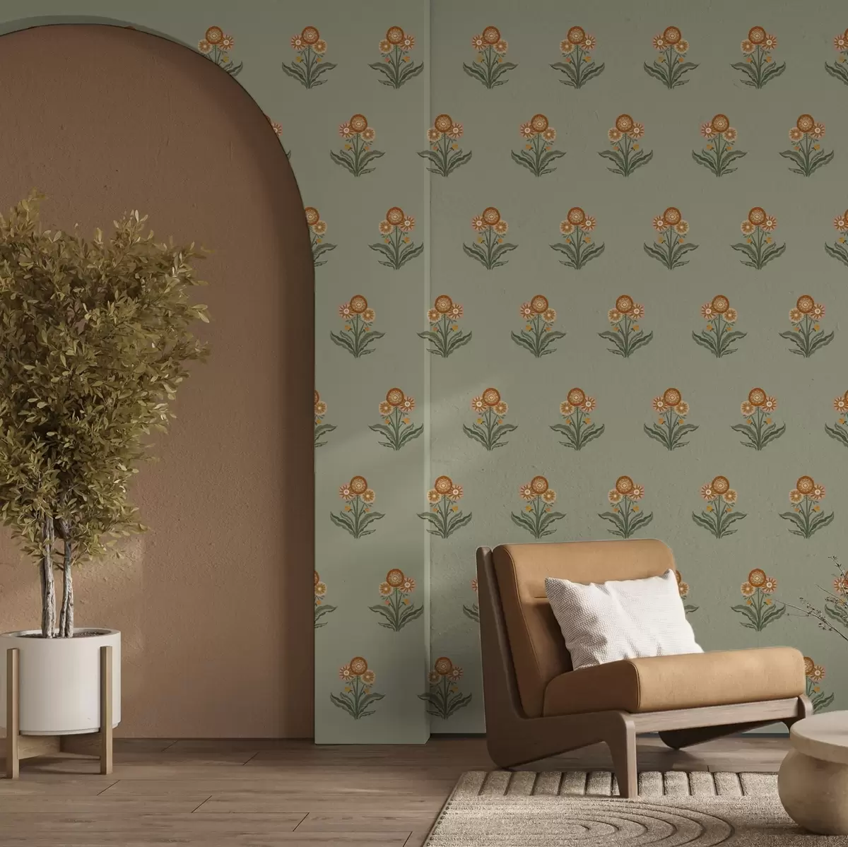 Papel pintado Flores estilizadas sobre fondo oliva, tonos cálidos Nr. a00494v2