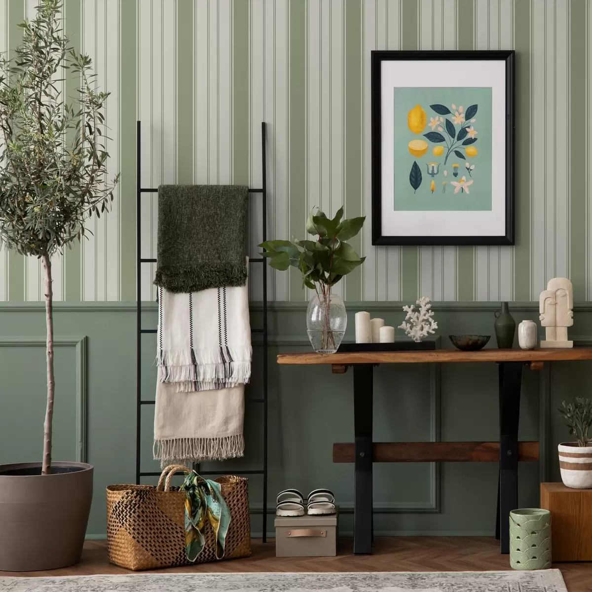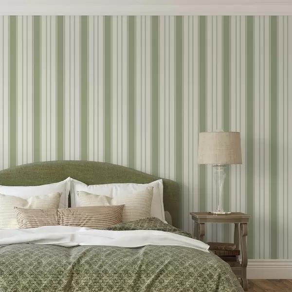 Papel pintado Fondo crema con rayas verticales verdes uniformes a00560