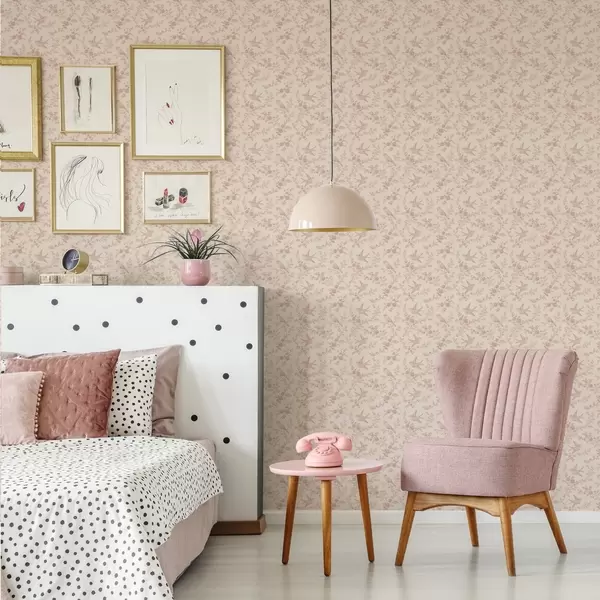 Papel pintado Pájaros y rosas, estampado vintage en rosa empolvado Nr. a00587
