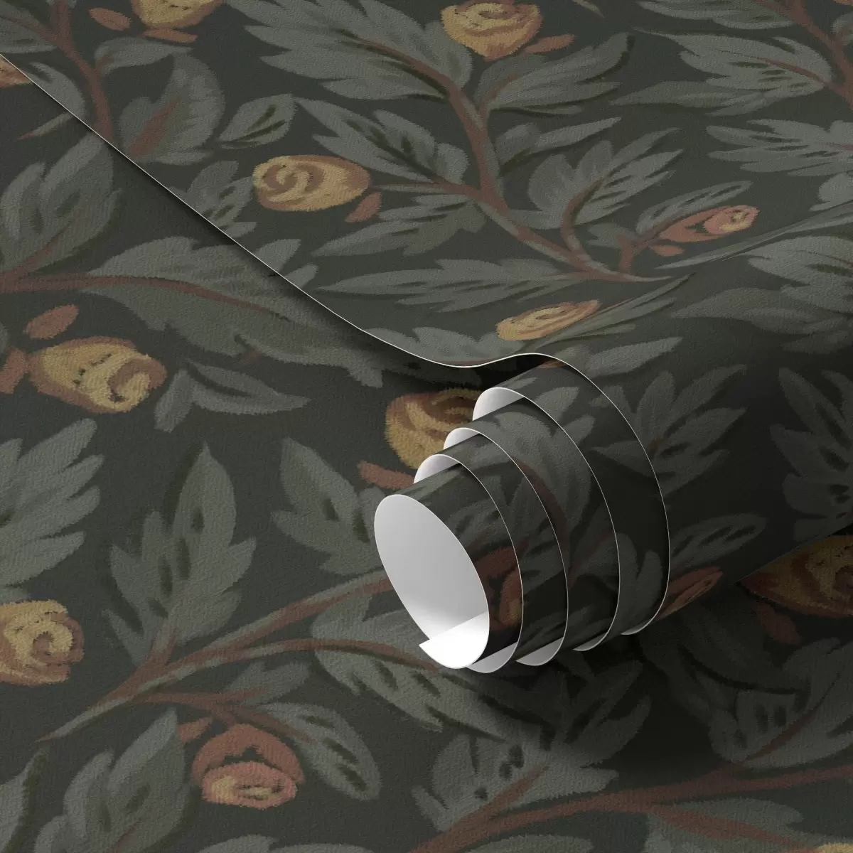 Papel pintado Estampado floral oscuro con capullos y hojas amarillos a00598