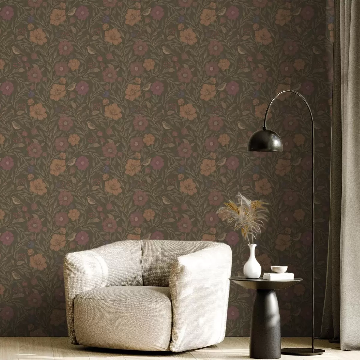 Papel pintado Flores otoñales y pájaros sobre fondo marrón oliva Nr. a00605