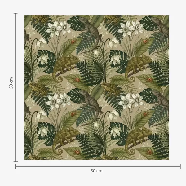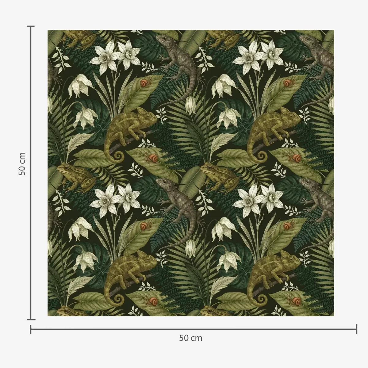 Papel pintado Camaleones y hojas tropicales, flores blancas, fondo oscuro Nr. a00608v1