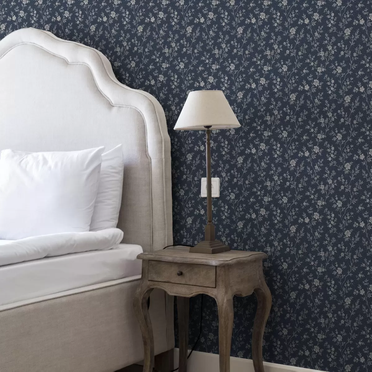Papel pintado Fondo azul marino oscuro con finas ramas y flores de color beige Nr. a00612